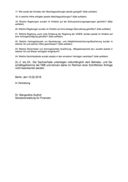 17. Wie wurde der Komplex der Abschlagszahlungen jeweils geregelt? (bitte auflisten) 18. In welcher Höhe erfolgten jeweils Abschlagszahlungen? (bitte auflisten) 19. Welche Regelungen wurden im Hinblick auf die Schlussrechnungsregelungen getroffen? (Bitte auflisten) 20. Welche Regelungen wurden im Hinblick auf eine etwaige Überzahlung getroffen? (bitte auflisten) 21. Welche Regelung, auch unter Einbezug der Regelung der VOB/B, wurden jeweils im Hinblick auf eine Vertragskündigung getroffen? (bitte auflisten) 22. Welche Vertragsklauseln zur Bauleistungs- und Haftpflichtversicherung/Absicherung wurden in welcher Art und welcher Höhe geschlossen? (bitte auflisten) 23. Welche Sicherheiten (zur termingerechten Ausführung., Mängelansprüche etc.) wurden jeweils in welcher Art und Weise vertraglich eingeräumt? 24. Welche Gerichtsstände wurden jeweils in den einzelnen Verträgen vereinbart? (bitte auflisten) Zu 2. bis 24.: Die Sachverhalte unterliegen vollumfänglich dem Betriebs- und Ge- schäftsgeheimnis der FBB und können daher im Rahmen einer Schriftlichen Anfrage nicht beantwortet werden. Berlin, den 19.02.2018 In Vertretung Dr. Margaretha Sudhof Senatsverwaltung für Finanzen