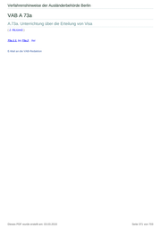Verfahrenshinweise der Ausländerbehörde Berlin VAB A 73a A.73a. Unterrichtung über die Erteilung von Visa ( 2. RiLiUmG ) 73a.1.1. bis 73a.2 . frei E-Mail an die VAB-Redaktion Dieses PDF wurde erstellt am: 03.03.2015 Seite 371 von 703