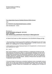 Drucksache 18 / 15 610 Schriftliche Anfrage 18. Wahlperiode Schriftliche Anfrage der Abgeordneten Susanna Kahlefeld (GRÜNE) vom 09. Juli 2018 (Eingang beim Abgeordnetenhaus am 13. Juli 2018) zum Thema: Anerkennung ausländischer Abschlüsse im Bildungsbereich und Antwort vom 30. Juli 2018 (Eingang beim Abgeordnetenhaus am 02. Aug. 2018) Die Drucksachen des Abgeordnetenhauses sind bei der Kulturbuch-Verlag GmbH zu beziehen. Hausanschrift: Sprosserweg 3, 12351 Berlin-Buckow · Postanschrift: Postfach 47 04 49, 12313 Berlin, Telefon: 6 61 84 84; Telefax: 6 61 78 28.