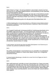 2 Zu 3.: Siehe Antwort zu Frage 1. Es wird grundsätzlich unterschieden zwischen der Aner- kennung einer im Heimatland abgeschlossenen Lehrerausbildung und der Gleichstel- lung mit einem Berliner Lehramt. Für die sozialpädagogischen Berufsgruppen gilt, dass die im Herkunftsland erworbe- ne Ausbildung auf die Anerkennungsfähigkeit mit dem Referenzberuf geprüft wird. Die positiv geprüften Abschlüsse erhalten nach Erfüllung von Auflagen die staatliche Anerkennung. Eine teilweise Gleichstellung gibt es für alle genannten Berufsabschlüsse nicht. 4. Welche Angebote gibt es in den einzelnen Bereichen, um Menschen mit einer teilweise anerkann- ten beruflichen Qualifikation zur vollen Anerkennung weiter zu qualifizieren? (Bitte für die einzelnen Berufsbereiche spezifizieren) Zu 4.: Zum Ausgleich bestehender fachwissenschaftlicher Ausbildungsunterschiede sind in Einzelfällen ergänzende Studien- und Prüfungsleistungen erforderlich. Zum Aus- gleich schulpraktischer Ausbildungsunterschiede ist der schulpraktische Teil des An- passungslehrganges vergleichbar dem Referendariat zu absolvieren. Für die sozialpädagogischen Berufe gilt hier, dass in der Regel Anpassungsmaß- nahmen zu absolvieren sind. Dazu gehören immer die rechtlichen Grundlagen für die jeweilige Berufsgruppe. Ggf. müssen auch fachliche Ergänzungen nachstudiert wer- den und bei fehlenden Sprachkenntnissen werden Sprachkurse zur Erreichung des erforderlichen Sprachniveaus (C1) belegt. 5. Worin bestehen nach Kenntnis des Senats die größten Schwierigkeiten in der Anerkennung von Lehrkräften, die ausländische Qualifikationen mitbringen? Zu 5.: Die größten Schwierigkeiten in der Anerkennung von Lehrkräften mit ausländischer Lehrerqualifikation bestehen im Fehlen eines zweiten Faches und in mangelnden Deutschkenntnissen. 6. Inwieweit bestehen Bestrebungen, Lehrkräfte mit nur einem Fach für die Tätigkeit als Lehrer*in Berlin zu ermöglichen? Zu 6.: Berlin stellt bereits jetzt Lehrkräfte mit einem Unterrichtsfach ein. Dieses sind entwe- der ausländische Lehrkräfte nach Recht des Heimatlandes oder Lehrkräfte ohne vol- le Lehrbefähigung. Nach Beschluss der Kultusministerkonferenz ist es möglich, dass Lehrkräfte mit dem Fach Kunst oder Musik ein Lehramt erwerben. Welche Möglich- keiten darüber hinaus zukünftig bestehen, wird auf der Ebene der Kultusministerkon- ferenz geprüft.