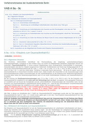 Verfahrenshinweise der Ausländerbehörde Berlin VAB A 9a - 9c Inhaltsverzeichnis A.9a.- A.9.c Erlaubnis zum Daueraufenthalt-EU ...................................................................................................................... 78 9a.0. Allgemeine Hinweise ................................................................................................................................................. 78 9a.1. Wirkbereich der Erlaubnis zum Daueraufenthalt-EU ................................................................................................ 78 9a.2.1.0. Erteilungsvoraussetzungen .......................................................................................................................... 79 9a.2.1.1.0. Anrechenbare Aufenthaltszeiten ........................................................................................................ 79 9a.2.1.1.1. Anrechnung von rechtmäßigen Aufenthaltszeiten ohne Besitz eines Titels gem. ........................... 79 § 4 Abs. 1 ............................................................................................................................................................. 79 9a.2.1.1.2. Anrechnung von Aufenthaltszeiten trotz Ausreise aus dem Bundesgebiet, ohne dass der Titel erloschen ist (§ 9 b S. 1 Nr. 1 sowie S. 3 und 4) ................................................................................................ 80 9a.2.1.1.3. Anrechnung von Aufenthaltszeiten trotz Ausreise aus dem Bundesgebiet, obwohl der Titel erloschen ist (§ 9 b S. 1 Nr. 2) ............................................................................................................................................. 80 9a.2.1.1.4. Anrechnung von Zeiten des Besitzes der Blauen Karte EU eines anderen Mitgliedstaates der EU (§ 9b Abs. 2) ................................................................................................................................................................. 81 9a.2.1.2. Gesicherter Lebensunterhalt (§ 9 a Abs. 2 Nr. 2, § 9 c) ...................................................................... 81 9a.2.1.3 - 9a.2.1.4. Hinreichende Integration (Sprachkenntnisse, Kenntnisse der Gesellschaftsordnung)und Wohnraum (§ 9 a Abs. 2 Nr. 3, 4 und 6) ............................................................................................................. 83 9a.3.0. Ausschluss von der Möglichkeit des Erwerbs einer Erlaubnis Daueraufenthalt-EU ....................................... 83 A.9a.- A.9.c Erlaubnis zum Daueraufenthalt-EU ( 19.08.2014 ; 19.05.2015 ) 9a.0. Allgemeine Hinweise Die Richtlinie 2003/109/EG betreffend die Rechtsstellung der langfristig aufenthaltsberechtigten Drittstaatsangehörigen, ermöglicht es dem Inhaber eines von einem EU-Mitgliedsstaat gewährten langfristigen Rechts auf Aufenthalt ( Daueraufenthalt-EU), in einem anderen Mitgliedsstaat einen verlängerbaren Aufenthaltstitel zu beantragen. Anwenderstaaten sind alle EU- Staaten ausgenommen Dänemark, Großbritannien und Irland (vgl. Erwägungsgründe Nr. 25 und 26 der Daueraufenthaltsrichtlinie).Mit §§ 2 Abs. 7, 4 Abs. 1 Nr. 4, 6 Abs. 4 S. 3, 9a –c, 38 a, 51 Abs. 6, 52 Abs. 8 und 9 sowie 56 Abs. 1 Nr. 1 a wird der Inhalt dieser Richtlinie in nationales Recht übernommen. §§ 9a bis 9c regeln, wann der Daueraufenthalt-EU in Deutschland erworben werden kann. Dabei knüpfen die Vorschriften an die Voraussetzungen eines Daueraufenthaltsrechts andere Voraussetzungen als das Aufenthaltsgesetz an die Erteilung einer Niederlassungserlaubnis. Es wurde daher neben der Niederlassungserlaubnis nach § 9 ein neuer Aufenthaltstitel „Erlaubnis zum Daueraufenthalt-EU“ eingeführt. Bei der Prüfung der Erteilungsvoraussetzungen gem. § 9 a Abs. 2 und 3 i.V.m. §§ 9 b und c für die Erlaubnis zum Daueraufenthalt-EU empfiehlt es sich strikt nach der Reihenfolge 9a.3 vor 9a.2. vorzugehen. Eine gekoppelte Prüfung an § 9 empfiehlt sich auf Grund der Komplexität und der unterschiedlichen Voraussetzungen der Vorschriften nicht. Da die Erlaubnis zum Daueraufenthalt-EU weiterführende Rechte gewährt und – etwa bei den anrechenbaren Voraufenthaltszeiten - geringere Anforderungen hat, empfiehlt es sich zudem, diesen Titel vorrangig zu prüfen. Merke: Die Regelung des § 29 Abs. 3 Satz 2 schließt nicht die Erteilung eines Daueraufenthalts-EU an den Ehegatten eines Inhabers eines humanitären Titels aus. Insoweit ist in diesen Fällen neben der Möglichkeit der Erteilung einer Niederlassungserlaubnis nach § 26 Abs. 4 auch die Erteilung nach § 9a zu prüfen. Alle Fälle, in denen vor Inkrafttreten des 2. ÄndG ein „Daueraufenthalt-EG“ eingetragen wurde oder ein Titel wegen eines Daueraufenthalt-EG nach § 7 Abs. 1 S. 3 erteilt wurde, gelten gem. § 101 Abs. 3 als Erlaubnis Daueraufenthalt-EU fort. Die Aufenthaltsetiketten sind anlassbezogen auszutauschen. Erfüllt der Ausländer einen fünfjährigen Anrechnungszeitraum lang auch die Voraussetzungen für die Erteilung einer Blauen Karte EU, ist bei der Erteilung der Erlaubnis zum Daueraufenthalt-EU auf dem eAT auch „ehem. Inhaber einer Blauen Karte EU“ zu vermerken (vgl. dazu AusReg2Info Titel / Historie). Die tatsächliche Erteilung bzw. der tatsächliche Besitz einer Blauen Karte über fünf Jahre ist hierfür nicht erforderlich. 9a.1. Wirkbereich der Erlaubnis zum Daueraufenthalt-EU Die Erlaubnis zum Daueraufenthalt-EU ist wie die Niederlassungserlaubnis ein unbefristeter Aufenthaltstitel und dieser – soweit das AufenthG nicht ausdrücklich etwas anderes regelt - von den Rechtsfolgen her weitgehend gleichgestellt. Der wesentliche Unterschied zur Niederlassungserlaubnis besteht darin, dass er den Inhabern eine größere Mobilität innerhalb und außerhalb der EU verschafft (vgl. § 51 Abs. 9 zum Erlöschen sowie § 38 a). Merke : Für in anderen Mitgliedstaaten langfristig Aufenthaltsberechtigte gilt § 9a Abs. 1 S. 3 ausweislich der Gesetzesbegründung nicht. I
