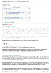 Verfahrenshinweise der Ausländerbehörde Berlin VAB A 19a Inhaltsverzeichnis A.19a. Blaue Karte EU .............................................................................. 154 Grundsätzliche Anmerkungen ............................................................ 154 19a.1.1 Höherer beruflicher Bildungsabschluss .......................... 154 19a.1.2. Zustimmung der Bundesagentur für Arbeit ................... 155 19a.1.3. Erforderliches Mindestgehalt ......................................... 155 19a.3. Gültigkeitsdauer und Nebenbestimmung zur Erwerbstätigkeit ...... 155 19a.4. Erlaubnis zum Arbeitsplatzwechsel ......................................... 156 19a.5. Ausschluss der Erteilung der Blauen Karte EU ....................... 156 19a.6. Niederlassungserlaubnis für Inhaber der Blauen Karte EU ..... 156 A.19a. Blaue Karte EU (28.12.2015; 20.09.2016 ) Grundsätzliche Anmerkungen Mit dem neuen § 19a werden wesentliche Regelungen der Hochqualifizierten-Richtlinie zur Erteilung der Blauen Karte EU umgesetzt. Bei Vorliegen der in Abs. 1 Nr. 1 – 3 geregelten Voraussetzungen für die Erteilung einer Blauen Karte EU besteht außer in den in Abs. 5 genannten Voraussetzungen ein Anspruch auf Erteilung zum Zweck der Ausübung einer der Qualifikation angemessenen Beschäftigung. Grundlage für die Erteilung kann nur ein Beschäftigungsverhältnis im Inland sein, allerdings ist der Sitz des Arbeitgebers unerheblich. Danach ist im Ergebnis nur entscheidend, ob der Arbeitsvertrag für eine Beschäftigung gerade in Deutschland geschlossen wurde und kein Fall der Entsendung vorliegt. Ein „ruhendes“ Arbeitsverhältnis im Ausland ist unschädlich, auch ist nicht entscheidend, ob in Deutschland Sozialversicherungsbeiträge gezahlt werden. Merke: Liegt ein ausschließlich ausländisches Arbeitsverhältnis vor, kommt eine Erteilung nur nach § 18 in Betracht. Hierbei ist die Bundesagentur für Arbeit gemäß § 72 Abs. 7 AufenthG fakultativ zu beteiligen. Merke: Aus Gründen der Verwaltungseffizienz empfiehlt sich daher folgende Prüfungsreihenfolge: Abs. 5 Abs. 1 Nr. 3 Abs. 1 Nr. 1a sodann ggf. Anfrage nach Abs. 1 Nr. 2. Die Blaue Karte EU kann ausschließlich als elektronischer Aufenthaltstitel erteilt werden. Beachte: Leiharbeitsverhältnisse können nur dann Grundlage für die Erteilung einer Blauen Karte sein, wenn es sich um eine zustimmungsfreie Beschäftigung handelt. Ist die Beschäftigung hingegen zustimmungspflichtig, kommt die Berücksichtigung eines Leiharbeitsverhältnisses nicht in Betracht, vgl. § 40 Abs. 1 Nr. 2 AufenthG. 19a.1.1 Höherer beruflicher Bildungsabschluss Ein höherer beruflicher Bildungsabschluss ist zwingende Erteilungsvoraussetzung für die Blaue Karte EU. Dies ist ein deutscher Hochschulabschluss, ein anerkannter ausländischer Hochschulabschluss oder ein einem deutschen Hochschulabschluss vergleichbarer ausländischer Hochschulabschluss. Nachgewiesen wird der Hochschulabschluss durch die Vorlage eines entsprechenden Hochschulzeugnisses. Merke: Bei Ärzten erfolgt mit der Erteilung der Approbation die Anerkennung der Vergleichbarkeit des ausländischen Hochschulabschlusses mit dem deutschen Hochschulabschluss; bei erteilter Berufserlaubnis nach § 10 Bundesärzteordnung ist ebenfalls von einer Vergleichbarkeit des ausländischen Hochschulabschlusses auszugehen. Ist unklar, ob ein ausländischer Hochschulabschluss vergleichbar ist, bzw. schon Zweifel bestehen, ob es sich überhaupt um einen Hochschulabschluss handelt, kann auf entsprechende Informationen der Zentral-stelle für ausländisches Dieses PDF wurde erstellt am: 07.11.2016 Seite 154 von 747