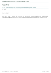 Verfahrenshinweise der Ausländerbehörde Berlin VAB A 91 A.91. Speicherung und Löschung personenbezogener Daten (2. ÄndG) 91.1. bis 91.2 frei 91.3. § 91 Abs. 3 schließt die im BDSG und dem Berliner Datenschutzgesetz neu aufgenommene Widerspruchsmöglichkeit der Betroffenen gegen eine automatisierte Datenverarbeitung für das Ausländerrecht aus. Dieses PDF wurde erstellt am: 07.11.2016 Seite 436 von 747