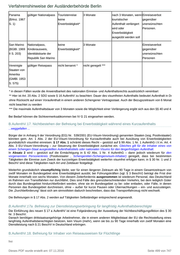 Verfahrenshinweise der Ausländerbehörde Berlin Panama gültiger Nationalpass Touristenreise (BAnz. 1967 S. 1) 3 Monate keine Erwerbstätigkeit* nach 3 Monaten, wenn Einreiseverbot touristischer Aufenthalt verlängert gegenüber unerwünschten wird oder Erwerbstätigkeit Personen. ausgeübt werden soll San Marino Nationalpass, (BGBl. 1969 Kinderausweis, II S. 203) Identitätskarte der keine 3 Monate Erwerbstätigkeit* gegenüber unerwünschten Republik San Marino Vereinigte gültiger Reisepass Einreiseverbot Personen nicht benannt * nicht geregelt *** Staaten von Amerika (GMBl. 1953 S. 575) * in diesen Fällen wurde die Anwendbarkeit des nationalen Einreise- und Aufenthaltsrechts ausdrücklich vereinbart ** Hier ist Art. 20 Abs. 2 SDÜ sowie § 16 AufenthV zu beachten: Dauer des visumfreien Aufenthalts bedeutet Aufenthalt in Deutschl ohne Rücksicht auf einen Voraufenthalt in einem anderen Schengener Vertragsstaat. Auch der Bezugszeitraum von 6 Monaten brau nicht beachtet zu werden *** Die maximale Aufenthaltsdauer von 3 Monaten sowie die Möglichkeit einer Verlängerung ergibt sich aus den §§ 40 und 41 Aufen Bei Bedarf können die Sichtvermerksabkommen bei IV G 21 eingesehen werden. B.AufenthV.17. Nichtbestehen der Befreiung bei Erwerbstätigkeit während eines Kurzaufenthalts ...weggefallen ... Bürger der in Anhang II der Verordnung (EG) Nr. 539/2001 (EU-Visum-Verordnung) genannten Staaten (sog. Positivstaater) könnten gem. Art. 1 Abs. 2 der EU-Visum-Verordnung für Kurzaufenthalte auch bei Ausübung von Erwerbstätigkeiten grundsätzlich visumfrei einreisen. § 17 Abs. 1 schränkt dieses Recht – gestützt auf § 99 Abs. 1 Nr. 1 AufenthG i.V.m. Art. 4 Abs. 3 EU-Visum-Verordnung – zur Steuerung der Erwerbstätigkeit zunächst ein. Gleiches gilt für die Inhaber eines von einem Schengen-Staat ausgestellten Aufenthaltstitels oder nationalen Visums für den längerfristigen Aufenthalt. In Absatz 2 wird – gestützt auf die Ermächtigung in § 42 Abs. 1 Nr. 4 AufenthG – dann jedoch wiederum für den vorgenannten Personenkreis (Positivstaater , Schengentitel-/Schengenvisum-Inhaber) geregelt, dass bei bestimmten Tätigkeiten die Einreise zum Zweck der kurzzeitigen Erwerbstätigkeit weiterhin visumfrei erfolgen kann; in § 30 Nr. 1 und 2 BeschV sind diese Tätigkeiten nach Art und Zeitdauer festgelegt. Weiterhin grundsätzlich visumpflichtig bleibt, wer für einen längeren Zeitraum als 90 Tage in einem Gesamtzeitraum von zwölf Monaten im Bundesgebiet eine Erwerbstätigkeit ausübt; bei Führungskräften (vgl. § 3 BeschV) beträgt die Frist drei Monate innerhalb von sechs Monaten. Von diesem Zeiterfordernis ausgenommen ist wiederum Personal, das Deutschland im Rahmen von Transitfahrten nur durchfährt. Dies sind Fälle des grenzüberschreitenden Verkehrs, bei dem lediglich Güter durch das Bundesgebiet hindurchbefördert werden, ohne sie im Bundesgebiet zu be- oder entladen, oder Fälle, in denen Personen das Bundesgebiet durchreisen, ohne – außer für kurze Pausen oder Übernachtungen – ein- und auszusteigen. Die „Durchbeförderung“ lässt sich am sinnvollsten dadurch beschreiben, dass das Transportfahrzeug nicht wechselt. Die Befreiungen in § 17 Abs. 2 werden auf Tätigkeiten Selbständiger entsprechend angewandt. B.AufenthV.17a. Befreiung zur Dienstleistungserbringung für langfristig Aufenthaltsberechtigte Die Einführung des neuen § 17 a AufenthV ist eine Folgeänderung der Ausweitung der Nichtbeschäftigungsfiktion des § 30 Nr. 3 BeschV. Danach benötigen drittstaatsangehörige Arbeitnehmer, die in einem anderen Mitgliedstaat der EU die Rechtsstellung eines langfristig Aufenthaltsberechtigten besitzen, kein Visum (mehr), wenn sie bis zu 90 Tage innerhalb von zwölf Monaten eine Dienstleistung nach § 21 BeschV in Deutschland erbringen. B.AufenthV.18. Befreiung für Inhaber von Reiseausweisen für Flüchtlinge frei Dieses PDF wurde erstellt am: 07.11.2016 Seite 499 von 747