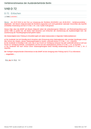 Verfahrenshinweise der Ausländerbehörde Berlin VAB D 72 D.72. Erlöschen ( 2. ÄndG; 21.08.2015 ) 72.1.1. Am 20.07.2015 ist die Frist zur Umsetzung der Richtlinie 2013/32/EU vom 26.06.2013 – Verfahrensrichtlinie – abgelaufen. Seit diesem Zeitpunkt findet die Richtlinie ungeachtet noch nicht geänderter nationaler Vorschriften des AsylVfG unmittelbar Anwendung und hat § 72 Abs. 1 Nr. 1 bis 2 außer Kraft gesetzt. Daraus folgt, dass das BAMF seit diesem Zeitpunkt neben der anlassbezogenen Widerrufs- und Rücknahmeprüfung auch solche Fälle zu prüfen hat, die bisher kraft Gesetzes zum Erlöschen der Anerkennung als Asylberechtigter bzw. der Zuerkennung der Flüchtlingseigenschaft geführt haben. Die Notwendigkeit einer Prüfung im Einzelfall ergibt sich dabei insbesondere in folgenden Fallkonstellationen: a) Der Ausländer hat sich freiwillig durch Annahme oder Erneuerung eines Nationalpasses oder sonstige Handlungen erneut dem Schutz des Staates, dessen Staatsangehörigkeit er besitzt, unterstellt (bisher § 72 Abs. 1, Nr. 1 AsylVfG). b) Der Ausländer ist freiwillig in das Land, das er aus Furcht vor Verfolgung verlassen hat oder außerhalb dessen er sich aus Furcht vor Verfolgung befindet, zurückgekehrt und hat sich dort niedergelassen (bisher § 72 Abs. 1, Nr. 1a AsylVfG). c) Der Ausländer hat nach Verlust seiner Staatsangehörigkeit diese freiwillig wiedererlangt (bisher § 72 Abs. 1, Nr. 2 AsylVfG). Bei Vorliegen entsprechender Erkenntnisse ist das BAMF mit der Anregung einer Prüfung nach § 73 zu informieren. ... weggefallen ... 72.1. 1a. bis 72.2. frei Dieses PDF wurde erstellt am: 07.11.2016 Seite 655 von 747