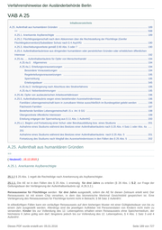 Verfahrenshinweise der Ausländerbehörde Berlin VAB A 25 Inhaltsverzeichnis A.25. Aufenthalt aus humanitären Gründen .............................................................................................................................. 189 == ....................................................................................................................................................................................... 598 A.25.1. Anerkannte Asylberechtigte ................................................................................................................................... 189 A.25.2. Flüchtlingseigenschaft nach dem Abkommen über die Rechtsstellung der Flüchtlinge (Genfer Flüchtlingskonvention)/Subsidiärer Schutz nach § 4 AsylVfG ........................................................................................... 190 A.25.3. Abschiebungsverbote gemäß § 60 Abs. 5 oder 7 .................................................................................................. 190 A.25.4. Aufenthaltserlaubnisse aus dringenden humanitären oder persönlichen Gründen oder erheblichem öffentlichen Interesse ............................................................................................................................................................................ 192 A.25.4a. .... Aufenthaltserlaubnis für Opfer von Menschenhandel ..................................................................................... 194 A.25.4a.0. Allgemeines ............................................................................................................................................ 194 A.25.4a.1. Erteilungsvoraussetzungen ....................................................................................................................... 194 Besondere Voraussetzungen .............................................................................................................................. 194 Regelerteilungsvoraussetzungen ........................................................................................................................ 195 Sperrwirkung ........................................................................................................................................................ 195 Erteilungsdauer .................................................................................................................................................... 345 A.25.4a.3. Verlängerung nach Abschluss des Strafverfahrens ................................................................................. 195 A.25.4a.4. Nebenbestimmungen ................................................................................................................................ 195 A.25.4b. Opfer von ausbeuterischen Arbeitsverhältnissen ................................................................................................ 196 A.25.5. Aufenthaltserlaubnis wegen eines bestehenden Ausreisehindernisses ................................................................ 196 Familiäre Lebensgemeinschaft kann in zumutbarer Weise ausschließlich im Bundesgebiet gelebt werden ............. 196 Patchwork-Familien .................................................................................................................................................... 197 Bestehende familiäre Lebensgemeinschaft i.S.v. Art. 6 GG ....................................................................................... 198 Übergeordnete öffentliche Interessen ......................................................................................................................... 199 Erteilung entgegen der Sperrwirkung aus § 11 Abs. 1 AufenthG ............................................................................... 200 A.25.s.1. Beginn und Fortsetzung einer Schul- oder Berufsausbildung bzw. eines Studiums ........................................... 201 Aufnahme eines Studiums während des Besitzes einer Aufenthaltserlaubnis nach § 25 Abs. 4 Satz 1 oder Abs. 4a ..... 201 Aufnahme eines Studiums während des Besitzes einer Aufenthaltserlaubnis nach § 25 Abs. 5 .............................. 201 Fortsetzung des Studiums nach Wegfall des Ausreisehindernisses in den Fällen des § 25 Abs. 5 ........................... 202 A.25. Aufenthalt aus humanitären Gründen == ( NeubestG ; 15.12.2015 ) A.25.1. Anerkannte Asylberechtigte 25.1.0 § 25 Abs. 1 regelt die Rechtsfolge nach Anerkennung als Asylberechtigter. 25.1.1. Die AE ist in den Fällen des § 25 Abs. 1 erstmalig für drei Jahre zu erteilen (§ 26 Abs. 1 S.2; zur Frage der Geltungsdauer der Verlängerung der Aufenthaltserlaubnis vgl. A.26.3.2.). Reiseausweise für Flüchtlinge werden für drei Jahre ausgestellt, sofern die AE für diesen Zeitraum erteilt wird. Der Reiseausweis ist mit einem Chip versehen, in dem das biometrische Merkmal Gesichtsbild gespeichert ist. Eine Verlängerung des Reiseausweises für Flüchtlinge kommt nicht in Betracht, § 58 Satz 2 AufenthV. In eilbedürftigen Fällen kann ein vorläufiger Reiseausweis auf dem bisherigen Muster mit einer Gültigkeitsdauer von bis zu einem Jahr ausgestellt werden. Allerdings sind die jeweiligen Aufkleber mit Personendaten von Kindern nicht mehr zu verwenden. Kinder bis zur Vollendung des 12. Lebensjahres erhalten einen Reiseausweis ohne Speichermedium, der höchstens 6 Jahre gültig sein darf, längstens jedoch bis zur Vollendung des 12. Lebensjahres, § 4 Abs. 1 Satz 3 und 4 AufenthV. Dieses PDF wurde erstellt am: 05.01.2016 Seite 189 von 727