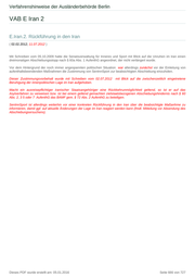 Verfahrenshinweise der Ausländerbehörde Berlin VAB E Iran 2 E.Iran.2. Rückführung in den Iran ( 02.02.2012; 11.07.2012 ) Mit Schreiben vom 05.10.2009 hatte die Senatsverwaltung für Inneres und Sport mit Blick auf die Unruhen im Iran einen dreimonatigen Abschiebungsstopp nach § 60a Abs. 1 AufenthG angeordnet, der nicht verlängert wurde. Vor dem Hintergrund der noch immer angespannten politischen Situation war allerdings zunächst vor der Einleitung von aufenthaltsbeendenden Maßnahmen die Zustimmung von SenInnSport zur beabsichtigten Abschiebung einzuholen. Dieser Zustimmungsvorbehalt wurde mit Schreiben vom 02.07.2012 Beruhigung der innenpolitischen Lage im Iran aufgehoben. mit Blick auf die zwischenzeitlich eingetretene Macht ein ausreisepflichtiger iranischer Staatsangehöriger eine Rückkehrunmöglichkeit geltend, so ist er auf das Asylverfahren zu verweisen bzw. ist bei einem geltend gemachten zielstaatsbezogenen Abschiebungshindernis nach § 60 Abs. 2, 3 5 oder 7 AufenthG das BAMF gem. § 72 Abs. 2 AufenthG zu beteiligen. SenInnSport ist allerdings weiterhin vor einer konkreten Rückführung in den Iran über die beabsichtigte Maßanhme zu informieren, damit ggf. auf aktuelle Änderungen der Lage im Iran reagiert werden kann (fmdl. Mitteilung vor Absendung des Abschiebungsersuchens). Dieses PDF wurde erstellt am: 05.01.2016 Seite 666 von 727