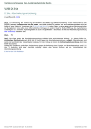 Verfahrenshinweise der Ausländerbehörde Berlin VAB D 34a D.34a. Abschiebungsanordnung ( AsylVfBeschlG; IntG ) 34a.0. Zur Umsetzung der Neufassung der Richtlinie 2011/95/EU (Qualifikationsrichtlinie) wurde insbesondere § 34a AsylVfG geändert. Normadressat ist das BAMF. Das BAMF erstellt im Rahmen von Rücküberstellungsfällen nach der Dublin-II- resp. Dublin-III- Verordnung (vgl. D.13.s.2. und 13.s.3. ) in allen Fällen, in denen aufgrund von Rechtsvorschriften der Europäischen Union oder eines völkerrechtlichen Vertrages ein anderer Staat für die Durchführung des Asylverfahrens zuständig ist – d.h. sowohl in Asylantragsfällen als auch in Aufgriffsfällen – Bescheide, die mit einer Abschiebungsanordnung oder -androhung versehen sind. 34a.1. frei 34a.2. Die Klage gegen die Abschiebungsanordnung entfaltet keine aufschiebende Wirkung. I n diesen Fällen ist einstweiliger Rechtsschutz nach § 80 Abs. 5 VwGO gegen die Abschiebungsanordnung möglich. Überstellungen sind somit erst nach Eintritt der Vollziehbarkeit zulässig. Für den Vollzug ist immer die Vollziehbarkeitsanordnung durch das BAMF abzuwarten. Anträge auf Gewährung vorläufigen Rechtschutzes gegen die Befristung eines Einreise- und Aufenthaltsverbots nach § 11 Abs. 2 AufenthG sind zwar ebenfalls zulässig, haben aber keinen Einfluss auf die Vollziehbarkeit der Abschiebungsanordnung. E-Mail an die VAB-Redaktion Dieses PDF wurde erstellt am: 05.08.2016 Seite 634 von 750