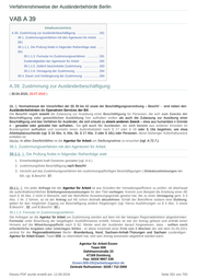 Verfahrenshinweise der Ausländerbehörde Berlin VAB A 39 Inhaltsverzeichnis A.39. Zustimmung zur Ausländerbeschäftigung ......................... 281 39.1. Zustimmungsverfahren mit den Agenturen für Arbeit ...... 281 39.1.1.1. Die Prüfung findet in folgender Reihenfolge statt: ...... 281 39.1.1.3. Formular im Zustimmungsverfahren ............. 281 Zuständigkeiten der Agenturen für Arbeit ................... 282 39.1.1.5. Zeitlich beschränkte Zustimmung ................. 283 39.1.1.6. Versagung der Zustimmung .......................... 284 39.4. Dauer und Verlängerung der Zustimmung ................. 284 A.39. Zustimmung zur Ausländerbeschäftigung ( 30.04.2015; 29.07.2015 ) 39. 0. Normadressat der Vorschriften der §§ 39 bis 42 sowie der Beschäftigungsverordnung – BeschV - sind neben den Ausländerbehörden die Operativen Services der BA . Die BeschV regelt sowohl die Zulassung zur Ausübung einer Beschäftigung für Personen, die sich zum Zwecke der Beschäftigung oder gewerblichen Ausbildung hier aufhalten wollen als auch die Zulassung zur Ausübung einer Beschäftigung und das Verfahren für Ausländer, die sich erlaubt zu einem anderen Zweck – etwa aus humanitäre n Gründe n - gestattet oder geduldet hier aufhalten.. Sie gilt auch für Ausländer, die sich bereits aus anderen Gründen im Bundesgebiet aufhalten und nunmehr einen Aufenthaltstitel nach § 17 oder § 18 oder § 19a begehren, wie etwa Arbeitsplatzsuchende (vgl. § 16 Abs. 4, Abs. 5b, § 17 Abs. 3 oder § 18c) oder Personen, deren bisheriger Aufenhaltszweck entfallen ist. Merke: In allen Zweifelsfällen ist die Agentur für Arbeit um Stellungnahme zu ersuchen (vgl. A.72.7.). 39.1. Zustimmungsverfahren mit den Agenturen für Arbeit 39.1.1. 1. Die Prüfung findet in folgender Reihenfolge statt: 1. Erwerbstätigkeit kraft Gesetzes gestattet (vgl. A.4.) 2. zustimmungsfreie Beschäftigung nach BeschV 3. Verzicht auf das Zustimmungsverfahren bei zustimmungspflichtigen Beschäftigungen ( Globalzustimmungen der BA; vgl. B.BeschV. 37. 39.1.1. 2. Vor jeder Anfrage bei der Agentur für Arbeit ist aus Gründen der Verwaltungseffizienz zu prüfen, ob überhaupt die aufenthaltsrechtlichen Erteilungsvoraussetzungen für den Titel vorliegen. Kommt zum Beispiel die Erteilung einer AE nach § 18 Abs. 2 nicht in Betracht, weil der Betroffene Ausweisungsgründe gesetzt hat, die zu einer Versagung gem. § 5 Abs. 1 Nr. 2 führen, so ist der Antrag auf AE schon deshalb abzulehnen. Erhält der Betroffene sodann eine Duldung, gelten für den möglichen Zugang zur Beschäftigung andere Regelungen (vgl. hierzu Ausführungen zu § 4 Abs. 3 sowie B.BeschV . 32. und B.BeschV. 33.). 39.1.1.3. Formular im Zustimmungsverfahren Die Anfragen an die Agentur für Arbeit um Zustimmung werden auf dem mit der hiesigen Regionaldirektion abgestimmten Formular unter Beachtung der beigefügten Ausfüllhinweise erstellt. Dieses ist wie ein Antrag gefasst und enthält einen Hinweis auf die Mitwirkungspflicht nach § 82. Weiter wird der Ausländer darauf hingewiesen, dass - sollten noch erforderliche Angaben oder Unterlagen fehlen - er diese innerhalb einer Frist von 2 Wochen der seit dem 01.05.2011 zentral für die Regionaldirektionen Berlin -Brandenburg, Nord, Sachsen-Anhalt-Thürungen und Sachsen zuständigen Agentur für Arbeit Essen, Team 009, zu übermitteln hat, weil sein Antrag ansonsten abgelehnt werden kann: Agentur für Arbeit Essen Team 009 Dahlmannstraße 23 47169 Duisburg Fax: 0203/ 9907 238 Essen.009-OS@arbeitsagentur.de Zentrale Rufnummer: 0228 / 713 2000 Dieses PDF wurde erstellt am: 12.09.2016 Seite 281 von 750