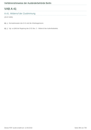 Verfahrenshinweise der Ausländerbehörde Berlin VAB A 41 A.41. Widerruf der Zustimmung (20.07.2005) 41. 1. Normadressaten des § 41 sind die Arbeitsagenturen. 41. 2. Vgl. zu § 41 die Regelung des § 52 Abs. 2 – Widerruf des Aufenthaltstitels. Dieses PDF wurde erstellt am: 12.09.2016 Seite 286 von 750