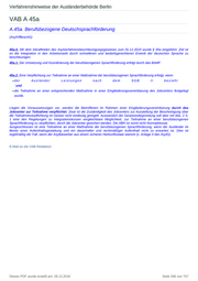 Verfahrenshinweise der Ausländerbehörde Berlin VAB A 45a A.45a. Berufsbezogene Deutschsprachförderung (AsylVfBeschG) 45a.0. Mit dem Inkrafttreten des Asylverfahrensbeschleunigungsgesetzes zum 01.11.2015 wurde § 45a eingeführt. Ziel ist es die Integration in den Arbeitsmarkt durch schnelleren und bedarfsgerechteren Erwerb der deutschen Sprache zu beschleunigen. 45a.1. Die Umsetzung und Koordinierung der berufsbezogenen Sprachförderung erfolgt durch das BAMF . 45a.2. Eine Verpflichtung zur Teilnahme an einer Maßnahme der berufsbezogenen Sprachförderung erfolgt, wenn der Ausländer Leistungen nach dem SGB II bezieht ' und die Teilnahme an einer entsprechenden Maßnahme in einer Eingliederungsvereinbarung des Jobcenters festgelegt wurde. Liegen die Voraussetzungen vor, werden die Betroffenen im Rahmen einer Eingliederungsvereinbarung durch das Jobcenter zur Teilnahme verpflichtet. Zwar ist die Zuständigkeit des Jobcenters zur Ausstellung der Bescheinigung über die Teilnahmeverpflichtung im Gesetz nicht eindeutig geregelt. Ausweislich der Gesetzesbegründung soll aber mit Abs. 2 S. 1 eine den Regelungen zu Integrationskursen vergleichbare Möglichkeit, zur Teilnahme an einer berufsbezogenen Sprachförderung zu verpflichten, durch die Jobcenter gesichert werden. Die ABH ist somit nicht Normadressat. Ausgeschlossen ist eine Teilnahme an einer Maßnahme der berufsbezogenen Sprachförderung, wenn der Ausländer im Besitz einer Aufenthaltsgestattung und ein dauerhafter und rechtmäßiger Aufenthalt nicht zu erwarten ist. Dies ist regelmäßig der Fall, wenn der Asylbewerber aus einem sicheren Herkunftsstaat stammt (s. Anlage II des AsylG). E-Mail an die VAB-Redaktion Dieses PDF wurde erstellt am: 28.12.2016 Seite 296 von 747