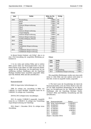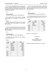 Abgeordnetenhaus Berlin – 17. Wahlperiode Drucksache 17 / 15 044 Polizei Jahr Delikt Höhe der Be- Erfolg lohnung 2008 Brandstiftung 2.000 € mit Mord 5.000 € mit Raub 2.500 € mit Schwere Körperverletzung 500 € Mord 5.000 € mit Mord 5.000 € Schwere Körperverletzung 10.000 € Vergewaltigung 3.000 € Schwere Körperverletzung 2.000 € mit 2009 Schwere Körperverletzung 5.000 € Sachbeschädigung (Brand) 10.000 € 2010 Raub 500 € Raub 1.000 € 2011 Raub 1.000 € Gefährliche Körperverletzung 2.000 € Raub 2.500 € 2012 Gefährliche Körperverletzung 2.500 € Gefährliche Körperverletzung 2.000 € In diesem Kontext bedeutet „mit Erfolg“, dass es zu einer (Teil-)Auszahlung der ausgelobten Belohnung ge- Polizei kommen ist. Jahr Delikt Höhe 2008 Mord 2.500 € 3. In wie vielen und welchen Fällen und in welcher Raub 2.500 € Höhe jeweils haben die Staatsanwaltschaften sowie die 2009 Mord 4.000 € Polizei Berlin in den Jahren seit 2008 ausgesetzte Beloh- Raub 2.000 € nungen für die Mitwirkung von Privatpersonen bei der 2010 Brandstiftung 2.000 € Aufklärung strafbarer Handlungen oder der Ergreifung 2013 Gefährliche Körperverletzung 1.500 € flüchtiger Straftäter*innen tatsächlich ausgezahlt? (Bitte nach Fall, Behörde, Höhe und Jahr aufschlüsseln.) Die ausgelobten Belohnungen werden zum einen nicht immer in voller Höhe und zum anderen nicht immer in Zu 3.: dem Jahr, in dem sie ausgelobt wurden, ausgezahlt. Staatsanwaltschaft 4. Wie hoch waren die Gesamtbeträge der durch die 2008: Es liegen keine Aufzeichnungen vor. Staatsanwaltschaften sowie der Polizei Berlin in den Jah- ren seit 2008 ausgelobten Belohnungen für die Mitwir- 2009: Es erfolgte eine Auszahlung in Höhe von kung von Privatpersonen bei der Aufklärung strafbarer 1.000,00 € in einem Mordfall. Ausgelobt waren bis zu Handlungen oder der Ergreifung flüchtiger Straftä- 5.000,00 €. Es erfolgte eine Verurteilung. ter*innen? (Bitte nach Behörde, Gesamtbetrag und Jahr aufschlüsseln.) 2010 bis 2012 erfolgten keine Auszahlungen. Zu 4. : 2013: Es wurden 15.000,00 € ausgezahlt. Ausgelobt waren bis zu 15.000,00 €. Es erfolgte eine Verurteilung Jahr Staatsanwaltschaft Polizei_______ wegen Körperverletzung mit Todesfolge. 2008 Keine Aufzeichnungen 35.000,00 € 2009 48.000,00 € 15.000,00 € 2014 (Stand 1. Dezember 2014): Es erfolgte keine 2010 30.000,00 € 1.500,00 € Auszahlung. 2011 62.500,00 € 5.500,00 € 2012 45.000,00 € 4.500,00 € 2013 35.000,00 € 0,00 € 2014 4.000,00 € 0,00 € (Stand 1. Dezember 2014) 3