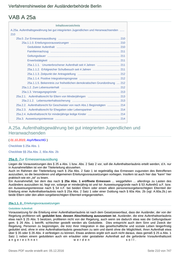 Verfahrenshinweise der Ausländerbehörde Berlin VAB A 25a Inhaltsverzeichnis A.25a. Aufenthaltsgewährung bei gut integrierten Jugendlichen und Heranwachsenden ...... 210 25a.0. Zur Ermessensausübung ............................................................................... 210 25a.1.1.0. Erteilungsvoraussetzungen ............................................................... 210 Geduldeter Aufenthalt ................................................................................. 210 Familiennachzug ......................................................................................... 211 Geltungsdauer ............................................................................................. 211 Erwerbstätigkeit ........................................................................................... 211 25a.1.1.1. Ununterbrochener Aufenthalt seit 4 Jahren ............................. 211 25a.1.1.2. Erfolgreicher Schulbesuch seit 4 Jahren ................................... 211 25a.1.1.3. Zeitpunkt der Antragstellung ...................................................... 212 25a.1.1.4. Positive Integrationsprognose .................................................... 212 25a.1.1.5. Bekenntnis zur freiheitlichen demokratischen Grundordnung .... 212 25a.1.2. Zum Lebensunterhalt ........................................................................... 212 25a.1.3. Versagungsgründe ............................................................................... 213 25a.2.1. Aufenthaltsrecht für Eltern von Minderjährigen ......................................... 213 25a.2.1.2. Lebensunterhaltssicherung ............................................................. 213 25a.2.2. Aufenthaltsrecht für Geschwister von nach Abs.1 Begünstigten ................ 214 25a.2.3. Aufenthaltsrecht für Ehegatten oder Lebenspartner .................................. 214 25a.2.4. Aufenthaltsrecht für minderjährige ledige Kinder ......................................... 214 25a.3. Ausweisungsinteresse ................................................................................... 214 A.25a. Aufenthaltsgewährung bei gut integrierten Jugendlichen und Heranwachsenden ( 01.10.2015; AsylVfbeschlG ) Checkliste § 25a Abs. 1 Checkliste §§ 25a Abs. 2, 60a Abs. 2b 25a.0. Zur Ermessensausübung Liegen die Voraussetzungen des § 25 a Abs. 1 bzw. Abs. 2 Satz 2 vor, soll die Aufenthaltserlaubnis erteilt werden, d.h. nur in Ausnahmefällen ist von der Titelerteilung abzusehen. Auch im Rahmen der Titelerteilung nach § 25a Abs. 2 Satz 1 ist regelmäßig das Ermessen zugunsten des Betroffenen auszuüben, so die besonderen und allgemeinen Erteilungsvoraussetzungen vorliegen. Insofern ist auch hier das “kann“ hier praktisch wie ein „ist“ zu lesen. Ein Ausnahmefall, bei dem das nach § 25a Abs. 1 eröffnete Ermessen ... weggefallen ... allerdings zu Lasten des Ausländers auszuüben ist, liegt vor, solange er minderjährig ist und Ist- Ausweisungsgründe nach § 53 AufenthG a.F. bzw. ein Ausweisungsinteresse nach § 54 n.F. bei beiden Eltern oder einem allein personensorgeberechtigten Elternteil der Erteilung einer Aufenthaltserlaubnis nach § 25a Abs. 2 Satz 1 oder einer Duldung nach § 60a Abs. 2b (vgl. A.60a.2b.) an beide Eltern oder den allein sorgeberechtigten Elternteil entgegenstehen. 25a.1.1. 0 . Erteilungsvoraussetzungen Geduldeter Aufenthalt Voraussetzung für die Erteilung einer Aufenthaltserlaubnis ist nach dem Gesetzeswortlaut, dass der Ausländer, der von der Regelung profitieren will, geduldet bzw. dessen Abschiebung auszusetzen ist. Ausländer, die eine Aufenthaltserlaubnis etwa nach § 25 Abs. 5 besitzen, profitieren nicht von der Regelung, auch wenn sie dadurch etwa was die Geltungsdauer gem. § 26 Abs. 1 betrifft, schlechter gestellt werden als Geduldete. Dies entspricht auch dem Sinn und Zweck der Regelung, Personen zu begünstigen, die trotz ihrer Integration in das gesellschaftliche und soziale Leben längerfristig geduldet sind, ohne in eine Aufenthaltserlaubnis gewachsen zu sein und damit ohne die Möglichkeit, ihren Aufenthalt etwa über § 35 oder § 26 Abs. 4 verfestigen zu können. Etwas anderes ergibt sich auch nicht daraus, dass gemäß § 25 a Abs. 1 Satz 1 neben einem geduldeten auch ein erlaubter oder gestatteter Aufenthalt auf die geforderte Voraufenthaltszeit a n g e r e c h n e t w e r d e n s o l l . Dieses PDF wurde erstellt am: 05.12.2016 Seite 210 von 747