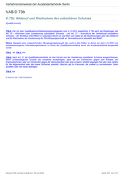 Verfahrenshinweise der Ausländerbehörde Berlin VAB D 73b D.73b. Widerruf und Rücknahme des subsidiären Schutzes (QualRiLiUmsG) 73b.0. Der mit dem Qualifikationsrichtlinienumsetzungsgesetz zum 1.12.2013 eingeführte § 73b setzt die Regelungen der Art. 16 – Erlöschen einer Zuerkennung subsidiären Schutzes - und Art. 17 – Ausschluss der Gewährung subsidiären Schutzes - der Richtlinie 2011/95/EU in nationales Recht um und lehnt sich dabei an die Bestimmungen über den Widerruf und die Rücknahme der Zuerkennung der Flüchtlingseigenschaft an. Normadressat ist ebenfalls das BAMF. Merke: Mangels einer entsprechenden Übergangsregelung gilt dies auch in den Fällen, in denen vor dem 1.12.2013 ein zielstaatsbezogenes Abschiebungshindernis im Sinne der Qualifikationsrichtlinie durch die Ausländerbehörde festgestellt wurde. 73b.1 . bis 73b.2. frei 73b.3. Nach Art. 17 der Qualifikationsrichtlinie ist eine Person von der Gewährung subsidiären Schutzes ausgeschlossen, wenn schwerwiegende Gründe die Annahme rechtfertigen, dass sie ein Verbrechen gegen den Frieden, ein Kriegsverbrechen oder ein Verbrechen gegen die Menschlichkeit oder eine schwere Straftat begangen hat oder eine Gefahr für die Allgemeinheit oder die innere Sicherheit darstellt. Gleiches gilt für Personen, die andere zu vorstehenden Taten anstiften oder sich daran beteiligen. 73b.4. frei E-Mail an die VAB-Redaktion Dieses PDF wurde erstellt am: 05.12.2016 Seite 657 von 747