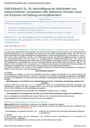 Verfahrenshinweise der Ausländerbehörde Berlin VAB B.BeschV.31.-33. Beschäftigung bei Aufenthalten aus völkerrechtlichen, humanitären oder politischen Gründen sowie von Personen mit Duldung und Asylbewerbern Inhaltsverzeichnis B.BeschV.31.-33. Beschäftigung bei Aufenthalten aus völkerrechtlichen, humanitären oder politischen Gründen sowie von Personen mit Duldung und Asylbewerbern ............................................................................................................................... 562 ............................................................................................................................................................................................ 621 B.BeschV.31. Beschäftigung bei Aufenthalt aus völkerrechtlichen, humanitären oder politischen Gründen ..................... 562 B.BeschV.32. Beschäftigung von Personen mit Duldung .................................................................................................. 562 B.BeschV.33. Versagung der Erlaubnis zur Ausübung einer Beschäftigung von Personen mit Duldung ......................... 565 B.BeschV.31.-33. Beschäftigung bei Aufenthalten aus völkerrechtlichen, humanitären oder politischen Gründen sowie von Personen mit Duldung und Asylbewerbern ( IntG; 18.10 .2016; 08.11.2016 ) B.BeschV.31. Beschäftigung bei Aufenthalt aus völkerrechtlichen, humanitären oder politischen Gründen § 31 räumt allen Ausländerinnen und Ausländern, die eine AE aus humanitären Gründen besitzen, einen uneingeschränkten Arbeitsmarktzugang ein. Der Gesetzgeber geht davon aus, dass diese Personengruppe bereits nach der bis zum 30.06.2013 gültigen Rechtslage weitestgehend uneingeschränkten Arbeitsmarktzugang hatte (vgl. insbesondere § 25 Abs. 1 Satz 4, Abs. 2 Satz 2 AufenthG, § 3 b Abs. 1 Nr. 2 BeschVerfV in der bis zum 30.06.2013 gültigen Fassung). Im Interesse der Rechtsvereinfachung wird das Recht auf uneingeschränkten Arbeitsmarktzugang allein vom Besitz der Aufenthaltserlaubnis abhängig gemacht. Die ab dem 01.07.2013 geltende Rechtslage ist von dem Grundsatz geprägt, dass alle Ausländerinnen und Ausländer, die sich hier rechtmäßig aufhalten, auch arbeiten dürfen (vgl. BR-Drs. 182/13, S. 23 sowie § 27 Abs. 5 AufenthG i.d.F. des Gesetzes zur Verbesserung der Rechte von international Schutzberechtigten und ausländischen Arbeitnehmern). Dies soll auch die Inanspruchnahme von Sozialleistungen vermindern. Das durch § 31 BeschV i.V.m. § 4 Abs. 2 Satz 3 AufenthG eingeräumte Ermessen ist daher grundsätzlich zu Gunsten der Inhaber von AEs nach dem 5. Abschnitt auszuüben und „Erwerbstätigkeit gestattet.“ zu verfügen. Das Ermessen ist hingegen zu Lasten des Betroffenen auszuüben, solange nicht feststeht, ob in näherer Zukunft eine Ausreiseverpflichtung durchzusetzen ist oder nicht. Deshalb ist in den Fällen des § 25 Abs. 4a und Abs. 4b AufenthG, solange sich der Betroffene noch keine 18 Monate rechtmäßig im Bundesgebiet aufgehalten hat (vgl. A.21.6.), wie folgt zu verfügen: „Beschäftigung nur nach Erlaubnis der Ausländerbehörde (§ 4 Abs. 2 AufenthG), selbstständige Tätigkeit nicht gestattet.“ In diesen Fällen ist mit § 26 Abs. 1 S. 1, 3 AufenthG von einem nur vorübergehenden Aufenthalt auszugehen. Die selbstständige Tätigkeit kann jedoch gestattet werden, wenn an ihr ein besonderes öffentliches Interesse besteht (vgl. A.21.6.). Nach 18 Monaten ist die Erwerbstätigkeit zu gestatten. Bei einer Aufenthaltserlaubnis nach § 25 Abs. 4 S. 1 AufenthG ist hingegen immer zu verfügen: „Erwerbstätigkeit nicht gestattet. Bei Verstößen droht Unternehmer/Arbeitgeber Bußgeld bis zu 500.000 Euro.“ Der nur vorübergehende Aufenthaltszweck in diesen Fällen wie z.B. die medizinische Behandlung oder die Patientenbegleitung ist in der Regel unvereinbar mit einer Erwerbstätigkeit. B.BeschV.32. Beschäftigung von Personen mit Duldung B.BeschV.32.0. Bei der Ausstellung von Duldungen sind folgende Grundsätze zu beachten: Stets ist die Ausschlussregelung des § 60a Abs. 6 AufenthG mit zu prüfen. In den Fällen des § 60a Abs. 6 AufenthG ist die Duldung immer mit der Nebenbestimmung „Erwerbstätigkeit nicht gestattet (§ 60a Abs. 6 Nr. ... AufenthG). Bei Verstößen droht Unternehmer/Arbeitgeber Bußgeld bis zu 500.000 Euro.“ zu verfügen. In den sonstigen Fällen wird bei Geduldeten der rechtliche Hinweis „Beschäftigung nur mit Erlaubnis der Ausländerbehörde.“ eingetragen. Wird seitens der Bundesagentur die Zustimmung erteilt, wird das Etikett mit dem Eintrag Dieses PDF wurde erstellt am: 20.03.2017 Seite 562 von 753