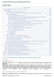 Verfahrenshinweise der Ausländerbehörde Berlin VAB A 60a Inhaltsverzeichnis A.60a. Vorübergehende Aussetzung der Abschiebung (Duldung) ............................................................................................ 385 Änderungsdatum ................................................................................................................................................................ 593 60a.2. Abschiebungsverbote und Ausreisehindernisse ..................................................................................................... 385 60a.2.2. Duldung für Zeugen/Zeuginnen von Verbrechen sowie für Opfer von Hasskriminalität ............................... 388 60a.2.3. Ermessensduldung ....................................................................................................................................... 389 60a.2.3.1. Schwangerschaft und Mutterschutz .................................................................................................... 389 Abschiebungsvollzug von Personen, von denen eine erhebliche Gefahr für Leib und Leben Dritter oder bedeutende Rechtsgüter der inneren Sicherheit ausgehen; Fälle des § 58a ...................................................... 390 60a.2.3.2. Bevorstehende Geburt eines Kindes .................................................................................................. 390 60a.2.3.3. Kurz bevorstehende Eheschließung oder Geburt eines ein Aufenthaltsrecht vermittelnden Kindes .. 391 60a.2.3.4. Fortsetzung einer qualifizierten Berufsausbildung .............................................................................. 391 60a.2.3.5. Fortsetzung einer Schulausbildung, einer Berufsvorbereitung oder eines Studiums ......................... 392 60a.2.4. Duldung zur Durchführung einer qualifizierten Berufsausbildung ................................................................. 393 60a.2.4.1. Qualifizierte Berufsausbildung ............................................................................................................ 393 60a.2.4.2. Aufenthaltsbeendigung steht nicht unmittelbar bevor ......................................................................... 394 60a.2.4.3. Ausschlussgrund des Absatz 6 ........................................................................................................... 394 60a.2.4.4. Ausschlussgrund des § 5 Abs. 4 ........................................................................................................ 395 60a.2.5. Erteilungsdauer ............................................................................................................................................. 395 Familienangehörige ............................................................................................................................................. 395 60a.2.6. Straffälligkeit ................................................................................................................................................. 396 60a.2.7. bis 60a.2.9. Abbruch/Nichtbetrieb der Ausbildung ........................................................................................ 396 60a.2.10. Duldung zwecks Suche eines neuen Ausbildungsplatzes .......................................................................... 396 60a.2.11. Duldung zur Arbeitsplatzsuche ................................................................................................................... 396 60a.2.12. Duldung aus anderen Gründen ................................................................................................................... 396 60a.2.13. Duldung während einer Aussetzung einer Beurkundung (missbräuchliche Vaterschaftsanerkennung) .... 396 60a.2a. Duldung nach gescheiterter Zurück- oder Abschiebung ....................................................................................... 397 60a.2b. Duldung von Familienangehörigen von Inhabern einer Aufenthaltserlaubnis nach § 25a Abs. 1 ......................... 397 60a.2c. Gesetzliche Vermutung für die Reisefähigkeit ...................................................................................................... 397 60a.2d. Verpflichtung zur unverzüglichen Vorlage von Attesten ........................................................................................ 398 60a.4. Bescheinigung über die Aussetzung der Abschiebung ........................................................................................... 398 60a.5. Versagung eines Antrags auf Aussetzung der Abschiebung .................................................................................. 399 60a.6. Versagung der Ausübung einer Erwerbstätigkeit von Personen mit Duldung ........................................................ 399 A.60a.s.1. Tatsächliche Abschiebungshindernisse ................................................................................................................... 401 A.60a.s.2. Zur Duldung des Aufenthalts ausländischer Strafgefangener .................................................................................. 402 A.60a.s.3. Fortsetzung einer Schulausbildung oder eines Studiums ........................................................................................ 403 A.60a. Vorübergehende Aussetzung der Abschiebung (Duldung) Änderungsdatum ( 21.11.2017; 07.12.2017 ) 60a.1.1. Die nach § 60a Abs. 1 S. 1 mögliche Aussetzung ist auf maximal 3 Monate begrenzt. Zuständig ist hier SenInnDS. 60a.1.2. Nach 3 Monaten sind nur Entscheidungen gem. § 23 Abs. 1 möglich. Zwar ist in § 60a Abs. 1 S. 2 noch eine Frist von 6 Monaten enthalten. Hierbei handelt es sich jedoch um ein redaktionelles Versehen des Gesetzgebers. Denn im Interesse eines möglichst bundeseinheitlichen Verwaltungsvollzuges hält es der Gesetzgeber für angezeigt, den Zeitraum, in dem die obersten Landesbehörden ohne das Einvernehmen des Bundesministeriums des Innern einen Abschiebestopp verfügen zu kö