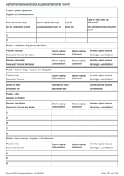 Verfahrenshinweise der Ausländerbehörde Berlin Podatci o putnim ispravama Angaben zu Reisedokumenten Vrsta dokumenta i broj Datum i mjesto izdavanja važi do Gdje se sada nalazi taj dokument? Art des Dokuments und Nr. Ausstellungsdatum und -ort gültig bis Wo befindet sich das Dokument jetzt? 1) 2) Podatci o roditeljima Angaben zu den Eltern Prezime i ime oca Datum rodjenja Geburtsdatum Mjesto rodjenja Geburtsort trenutno mjesto boravka Datum rodjenja Geburtsdatum Mjesto rodjenja Geburtsort trenutno mjesto boravka Mjesto rodjenja Geburtsort trenutno mjesto boravka Name und Vorname Datum rodjenja Geburtsdatum vjenan od dana rastavljen od dana udovac/udovica od dana verheiratet seit: geschieden seit: verwitwet seit: Name und Vorname des Vaters Prezime i ime majke Name und Vorname der Mutter derzeitiger Aufenthaltsort derzeitiger Aufenthaltsort Podatci o branom drugu Angaben zum Ehegatten Prezime i ime derzeitiger Aufenthaltsort Podatci o djeci Angaben zu Kindern Prezime i ime djeteta Name und Vorname des Kindes Datum rodjenja Geburtsdatum Mjesto rodjenja Geburtsort trenutno mjesto boravka Mjesto rodjenja Geburtsort trenutno mjesto boravka derzeitiger Aufenthaltsort 1) 2) 3) 4) 5) Podatci o brai i sestrama Angaben zu Geschwistern Prezime i ime Name und Vorname Datum rodjenja Geburtsdatum derzeitiger Aufenthaltsort 1) 2) 3) Dieses PDF wurde erstellt am: 01.06.2017 Seite 723 von 752