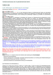 Verfahrenshinweise der Ausländerbehörde Berlin VAB A 83 A.83. Beschränkung der Anfechtbarkeit ( 2. RiLiUmG; NeubestG ) 83.1. § 83 schließt nur die Anfechtbarkeit der Versagung eines nationalen Visums und eines Passersatzes an der Grenze aus. Siehe auch die Hinweispflicht nach § 83 S. 2. Artikel 32 Absatz 3 des Visakodex sieht Rechtsmittel gegen die Ablehnung eines Antrags auf Erteilung eines Schengen- Visums vor, worunter auch Visa zu touristischen Zwecken sowie an der Grenze zu erteilende Schengen-Ausnahmevisa fallen. 83.2. Kein Widerspruchsverfahren bei Versagung einer Duldung, § 4 Abs. 2 S. 2 AGVwGO. Für die sonstigen Maßnahmen und Entscheidungen zur Vorbereitung und Durchsetzung der Ausreisepflicht gilt wie bisher § 4 Abs. 2 S. 2 AGVwGO. Des Weiteren ist auch gegen Ablehnungen von Anträgen auf Erteilung und Verlängerung einer Aufenthaltserlaubnis der Widerspruch in der Regel nicht statthaft. Dies folgt aus § 4 Abs. 2 S. 1 AGVwGO. Etwas anderes gilt aber unter Umständen dann, wenn durch die Entscheidung eine Ausreisepflicht nicht begründet wird. Dies ist bspw. dann möglich, wenn der Betreffende bereits einen Aufenthaltserlaubnis besitzt und dessen Antrag auf Erteilung eines anderen Aufenthaltstitels (Niederlassungserlaubnis oder einer Aufenthaltserlaubnis zu einem anderen Aufenthaltszweck) abgelehnt wird. 83.3. Diese Regelung schließt das Widerspruchsverfahren in Fällen, in denen das Bundesamt für Migration und Flüchtlinge nach § 11 Abs. 7 AufenthG ein Einreise- und Aufenthaltsverbot angeordnet hat und eine Befristungsentscheidung hierüber traf, aus. Zur näheren Verfahrensweise vgl. auch A.11.7. Dieses PDF wurde erstellt am: 23.10.2017 Seite 451 von 791