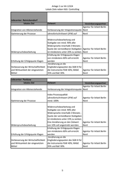 Anlage 2 zur KA 12324 Lokale Ziele neben KdU- Controlling Jobcenter: Tempelhof- Schöneberg lokales Ziel Zielwert Vereinbarungspartner 846 zusätzliche Integrationen in den Agentur für Arbeit Berlin Verbesserung Integration (BJO) BJO Teams Süd Anzahl 676 Bewerber Agentur für Arbeit Berlin Erfolgreicher Berufseinstieg (Orientierungsgröße) Süd Index Prozessqualität Jahresfortschrittwert (JFW) auf Agentur für Arbeit Berlin Prozessqualität 100% Süd Bestand Widersprüche über 3 Agentur für Arbeit Berlin Prozessqualität Monate = 0 Süd Stattgabequote vermeidbare Agentur für Arbeit Berlin Ergebnisqualität Stattgaben 10 % Süd Jobcenter: Charlottenburg- Wilmersdorf lokales Ziel Zielwert Vereinbarungspartner Agentur für Arbeit Berlin Integration von Alleinerziehende Verbesserung der Integrationsquote Nord Jahresfortschrittwert (JFW) auf Agentur für Arbeit Berlin Optimierung der Prozesse 100% Nord Widersruchsbearbeitung und Stattgabe von mind. 90% aller Widersprüche innerhalb 3 Monate ; Quote der vermeidbaren Stattgaben ist mindestens unter 20% zu senken. Eine Annäherung an den Zielwert Agentur für Arbeit Berlin Widerspruchsbearbeitung von 10% soll angestrebt werden. Nord Erhöhung der Erfolgsquote Klagen von mindestens 60% soll erreicht Agentur für Arbeit Berlin Erhöhung der Erfolgsquopte Klagen werden Nord Annäherung an die Eingliederungsquoten des SGB III für die Instrumente Förderung berufliche Weiterbildung (FbW) 40%, Maßnahmen zur Aktivierung Verbesserung der Wirtschaftlichkeit und beruflichen Eingliederung und Wirksamkeit der eingesetzten (MAbE) 35% und außerbetriebliche Agentur für Arbeit Berlin Mittel Berufsausbildung (BaE) 30%. Nord 2