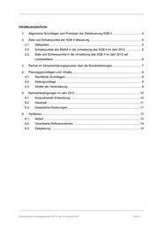 Inhaltsverzeichnis: 1. Allgemeine Grundlagen und Prinzipien der Zielsteuerung SGB II ................................... 4 2. Ziele und Schwerpunkte der SGB II-Steuerung............................................................... 5 2.1. Zielsystem............................................................................................................... 5 2.2. Schwerpunkte des BMAS in der Umsetzung des SGB II im Jahr 2012.................... 5 2.3. Ziele und Schwerpunkte in der Umsetzung des SGB II im Jahr 2012 auf Landesebene .......................................................................................................... 6 3. Partner im Zielvereinbarungsprozess über die Bundesleistungen................................... 7 4. Planungsgrundlagen und -inhalte.................................................................................... 8 4.1. Rechtliche Grundlagen............................................................................................ 8 4.2. Datengrundlage ...................................................................................................... 8 4.3. Inhalte der Vereinbarung......................................................................................... 9 5. Rahmenbedingungen im Jahr 2012 .............................................................................. 10 5.1. Konjunkturelle Entwicklung ................................................................................... 10 5.2. Haushalt................................................................................................................ 11 5.3. Gesetzliche Änderungen ....................................................................................... 11 6. Verfahren...................................................................................................................... 13 6.1. Ablauf.................................................................................................................... 13 6.2. Vereinbarte Referenzrahmen ................................................................................ 14 6.3. Zeitplanung ........................................................................................................... 15 Gemeinsames Planungsdokument 2012 vom 3. November 2011 Seite 3