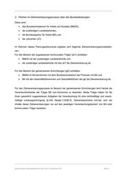 3. Partner im Zielvereinbarungsprozess über die Bundesleistungen Diese sind: das Bundesministerium für Arbeit und Soziales (BMAS), die zuständigen Landesbehörden, die Bundesagentur für Arbeit (BA) und die Jobcenter (JC). Im Rahmen dieses Planungsdokuments ergeben sich folgende Zielvereinbarungskonstellatio- nen: Für den Bereich der zugelassenen kommunalen Träger (zkT) schließen BMAS mit der zuständigen Landesbehörde und die zuständige Landesbehörde mit den zkT die Zielvereinbarung ab. Für den Bereich der gemeinsamen Einrichtungen (gE) schließen BMAS im Einvernehmen mit dem Bundesministerium der Finanzen mit BA und BA mit den Geschäftsführerinnen und Geschäftsführern der gE die Zielvereinbarung ab. Für den Zielvereinbarungsprozess im Bereich der gemeinsamen Einrichtungen sind hierbei die Verantwortlichkeiten der Träger BA und Kommune zu beachten. Beide Träger haben für die ihnen gesetzlich zugewiesenen Aufgaben die Verantwortung für eine rechtmäßige und zweck- mäßige Leistungserbringung (§ 44b Absatz 3 SGB II). Dementsprechend können sich die Inhalte dieser Zielvereinbarungen nur auf den jeweiligen Verantwortungsbereich von BA oder kommunalem Träger beziehen. Gemeinsames Planungsdokument 2012 vom 3. November 2011 Seite 7
