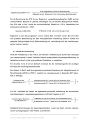 Σ der Integrationen (Januar bis Berichtsmonat) Integrationsquote (JFW) in % = Ø Bestand an eLb (Dezember VJ bis Vormonat des Berichtsmonats) Für die Berechnung des JFW für den Bestand an Langzeitleistungsbeziehern (LZB) wird der durchschnittliche Bestand an LZB seit Jahresbeginn bis zum aktuellen Bezugsmonat ermittelt. Der JFW stellt im Ziel 3 somit den durchschnittlichen Bestand an LZB im Jahresverlauf dar (Jahresdurchschnittswert = JDW). Bestand an LZB (JDW) = Ø Bestand an LZB (Januar bis Bezugsmonat) Ergänzend zu den Steuerungszielen können weitere Ziele vereinbart werden. Bei einer über eine qualitative Beschreibung des Ziels hinausgehenden Vereinbarung sollte im Vorfeld eine geeignete Datengrundlage für die Zielvereinbarung und -nachhaltung durch die Vereinbarungs- partner bestimmt werden. 4.3. Inhalte der Vereinbarung Inhalt der Vereinbarung zu Ziel 1 ist es, die Kennzahl „Veränderung der Summe der Leistungen zum Lebensunterhalt“ in ihrem Verlauf im Rahmen eines qualitativ hochwertigen Monitorings zu beobachten und ggf. mit der prognostizierten Entwicklung zu vergleichen. Für die Ziele 2 und 3 wird ein Zielwert vereinbart, der die Veränderungsrate der jeweiligen Kennzahl des Steuerungsziels beschreibt. Der Zielwert für Ziel 2 stellt die angestrebte prozentuale Veränderung der Integrationsquote im Monat Dezember 2012 (im JFW) im Vergleich zur Integrationsquote im Dezember 2011 (eben- falls im JFW) dar. Veränderung der Integrationsquote 2012 (Januar 2012 bis Dezember 2012) = -1 Integrationsquote in % Integrationsquote 2011 (Januar 2011 bis Dezember 2011) Für Ziel 3 beinhaltet der Zielwert die angestrebte prozentuale Veränderung des durchschnittli- chen Bestandes an Langzeitleistungsbeziehern in 2012 im Vergleich zu 2011. Veränderung des Bestandes Ø Bestand an LZB 2012 (Januar 2012 bis Dezember 2012) = -1 an LZB (JDW) in % Ø Bestand an LZB 2011 (Januar 2011 bis Dezember 2011) Detaillierte Beschreibungen der Steuerungsmethodiken zu den drei Zielen sind dem „Gemein- samen Grundlagenpapier“ unter Punkt 2. zu entnehmen. Gemeinsames Planungsdokument 2012 vom 3. November 2011 Seite 9