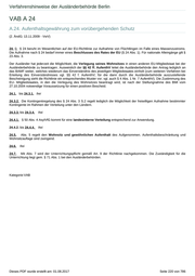 Verfahrenshinweise der Ausländerbehörde Berlin VAB A 25 Inhaltsverzeichnis A.25. Aufenthalt aus humanitären Gründen .............................................................................................................................. 221 Änderungsdatum ................................................................................................................................................................ 585 A.25.1. Anerkannte Asylberechtigte ................................................................................................................................... 221 A.25.2. Flüchtlingseigenschaft nach dem Abkommen über die Rechtsstellung der Flüchtlinge (Genfer Flüchtlingskonvention)/Subsidiärer Schutz nach § 4 AsylVfG ........................................................................................... 222 A.25.3. Abschiebungsverbote gemäß § 60 Abs. 5 oder 7 .................................................................................................. 222 A.25.4. Aufenthaltserlaubnisse aus dringenden humanitären oder persönlichen Gründen oder erheblichem öffentlichen Interesse ............................................................................................................................................................................ 224 A.25.4a. Aufenthaltserlaubnis für Opfer von Menschenhandel .......................................................................................... 225 A.25.4a.0. Allgemeines ............................................................................................................................................. 225 A.25.4a.1. Erteilungsvoraussetzungen ....................................................................................................................... 225 Besondere Voraussetzungen .............................................................................................................................. 226 Regelerteilungsvoraussetzungen ........................................................................................................................ 226 Sperrwirkung ........................................................................................................................................................ 226 Erteilungsdauer .................................................................................................................................................... 226 A.25.4a.3. Verlängerung nach Abschluss des Strafverfahrens .................................................................................. 226 A.25.4a.4. Nebenbestimmungen ................................................................................................................................ 227 A.25.4b. Opfer von ausbeuterischen Arbeitsverhältnissen ................................................................................................ 227 A.25.5. Aufenthaltserlaubnis wegen eines bestehenden Ausreisehindernisses ................................................................ 227 Familiäre Lebensgemeinschaft kann in zumutbarer Weise ausschließlich im Bundesgebiet gelebt werden ............. 227 Patchwork-Familien .................................................................................................................................................... 228 Bestehende familiäre Lebensgemeinschaft i.S.v. Art. 6 GG ....................................................................................... 229 Familiäre Lebensgemeinschaft mit volljährigen ehemals unbegleiteten Ausländern .................................................. 229 Übergeordnete öffentliche Interessen ......................................................................................................................... 229 Erteilung entgegen der Sperrwirkung aus § 11 Abs. 1 AufenthG ............................................................................... 230 A.25.s.1. Beginn und Fortsetzung einer Schul- oder Berufsausbildung bzw. eines Studiums ........................................... 231 Aufnahme eines Studiums während des Besitzes einer Aufenthaltserlaubnis nach § 25 Abs. 4 Satz 1 oder Abs. 4a ..... 231 Aufnahme eines Studiums während des Besitzes einer Aufenthaltserlaubnis nach § 25 Abs. 5 .............................. 231 Fortsetzung des Studiums nach Wegfall des Ausreisehindernisses in den Fällen des § 25 Abs. 5 ........................... 231 A.25. Aufenthalt aus humanitären Gründen Änderungsdatum ( Asylpaket II ; 14.02.2017, 16.05.2017 ) A.25.1. Anerkannte Asylberechtigte 25.1.0 § 25 Abs. 1 regelt die Rechtsfolge nach Anerkennung als Asylberechtigter. 25.1.1. Die AE ist in den Fällen des § 25 Abs. 1 erstmalig für bis zu drei Jahre und sechs Monate zu erteilen ( vgl. A.26.1. ; zur Frage der Geltungsdauer der Verlängerung der Aufenthaltserlaubnis vgl. A.26.2.1.). Reiseausweise für Flüchtlinge werden für höchstens drei Jahre ausgestellt, sofern die AE für diesen Zeitraum erteilt wird. Der Reiseausweis ist mit einem Chip versehen, in dem das biometrische Merkmal Gesichtsbild gespeichert ist. Eine Verlängerung des Reiseausweises für Flüchtlinge kommt nicht in Betracht, § 58 Satz 2 AufenthV. In eilbedürftigen Fällen kann ein vorläufiger Reiseausweis auf dem bisherigen Muster mit einer Gültigkeitsdauer von bis zu einem Jahr ausgestellt werden. Allerdings sind die jeweiligen Aufkleber mit Personendaten von Kindern nicht mehr zu verwenden. Kinder bis zur Vollendung des 12. Lebensjahres erhalten einen Reiseausweis ohne Speichermedium, der höchstens 6 Jahre gültig sein darf, längstens jedoch bis zur Vollendung des 12. Lebensjahres, § 4 Abs. 1 Satz 3 und 4 AufenthV. Dieses PDF wurde erstellt am: 01.08.2017 Seite 221 von 786