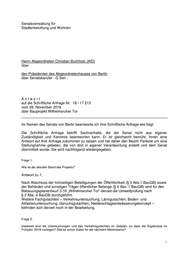 Senatsverwaltung für Stadtentwicklung und Wohnen Herrn Abgeordneten Christian Buchholz (AfD) über den Präsidenten des Abgeordnetenhauses von Berlin über Senatskanzlei - G Sen - Antwort auf die Schriftliche Anfrage Nr. 18 / 17 213 vom 28. November 2018 über Bauprojekt Wilhelmsruher Tor Im Namen des Senats von Berlin beantworte ich Ihre Schriftliche Anfrage wie folgt: Die Schriftliche Anfrage betrifft Sachverhalte, die der Senat nicht aus eigener Zuständigkeit und Kenntnis beantworten kann. Er ist gleichwohl bemüht, Ihnen eine Antwort auf Ihre Anfrage zukommen zu lassen und hat daher den Bezirk Pankow um eine Stellungnahme gebeten, die von dort in eigener Verantwortung erstellt und dem Senat übermittelt wurde. Sie wird nachfolgend wiedergegeben: Frage 1: Wie ist der aktuelle Stand des Projekts? Antwort zu 1: Nach Abschluss der frühzeitigen Beteiligungen der Öffentlichkeit (§ 3 Abs.1 BauGB) sowie der Behörden und sonstigen Träger öffentlicher Belange (§ 4 Abs. 1 BauGB) wird für den Bebauungsplanentwurf 3-18 „Wilhelmsruher Tor“ derzeit die Umweltprüfung nach § 2 Abs. 4 BauGB durchgeführt. Weitere Fachgutachten – Verkehrsuntersuchung, Lärmgutachten, Boden- und Altlastenuntersuchung, Geruchsgutachten, Niederschlagsentwässerungskonzept – befinden sich derzeit noch in der Bearbeitung. Frage 2: Inwieweit sind die Untersuchungen und das Verkehrsgutachten im Zeitplan, so dass die Ergebnisse im Frühjahr 2019 vorliegen? Gibt es schon Daten für die nächsten Meilensteine? 1