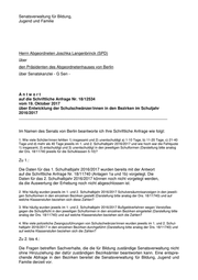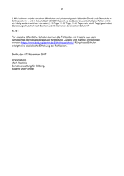 Senatsverwaltung für Bildung, Jugend und Familie Herrn Abgeordneten Joschka Langenbrinck (SPD) über den Präsidenten des Abgeordnetenhauses von Berlin über Senatskanzlei - G Sen - Antwort auf die Schriftliche Anfrage Nr. 18/12534 vom 19. Oktober 2017 über Entwicklung der Schulschwänzer/innen in den Bezirken im Schuljahr 2016/2017 ___________________________________________________________________ Im Namen des Senats von Berlin beantworte ich Ihre Schriftliche Anfrage wie folgt: 1. Wie viele Schüler/innen fehlten 1) insgesamt und 2) unentschuldigt a) 1-10 Tage, b) 11-20 Tage, c) 21-40 Tage und d) mehr als 40 Tage jeweils im 1. und 2. Schulhalbjahr 2016/2017 und wie hoch war die Fehlquote 1) insgesamt, 2) entschuldigt und 3) unentschuldigt in den jeweiligen Schulformen (Darstellung bitte analog der Drs. 18/11740 jeweils für die Schulklassen 5-10)? Zu 1.: Die Daten für das 1. Schulhalbjahr 2016/2017 wurden bereits mit der Antwort auf die Schriftliche Anfrage Nr. 18/11740 (Anlagen 1a und 1b) vorgelegt. Die Daten für das 2. Schulhalbjahr 2016/2017 können noch nicht vorgelegt werden, da die Auswertung der Erhebung noch nicht abgeschlossen ist. 2. Wie häufig wurden jeweils im 1. und 2. Schulhalbjahr 2016/2017 Schulversäumnisanzeigen in den jeweili- gen Schulformen in den einzelnen Bezirken gestellt (Darstellung bitte analog der Drs. 18/11740) und auf welche Klassenstufen beziehen sich diese Zahlen? 3. Wie häufig wurden jeweils im 1. und 2. Schulhalbjahr 2016/2017 Bußgeldverfahren wegen Verstoßes gegen die Schulpflicht in den jeweiligen Schulformen in den einzelnen Bezirken eingeleitet (Darstellung bitte analog der Drs. 18/11740) und auf welche Klassenstufen beziehen sich die Zahlen? 4. Wie viele polizeiliche Zwangszuführungen von Schulschwänzer/innen wurden jeweils im 1. und 2. Schul- halbjahr 2016/2017 in den einzelnen Bezirken durchgeführt (Darstellung bitte analog der Drs. 18/11740) und auf welche Klassenstufen beziehen sich die Zahlen? Zu 2. bis 4.: Die Fragen betreffen Sachverhalte, die die für Bildung zuständige Senatsverwaltung nicht ohne Hinzuziehung der dafür zuständigen Bezirksämter beantworten kann. Eine entspre- chende Abfrage in den Bezirken bereitet die Senatsverwaltung für Bildung, Jugend und Familie derzeit vor.