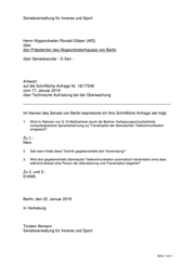 Drucksache 18 / 17 548 Schriftliche Anfrage 18. Wahlperiode Schriftliche Anfrage des Abgeordneten Ronald Gläser (AfD) vom 17. Januar 2019 (Eingang beim Abgeordnetenhaus am 18. Januar 2019) zum Thema: Technische Aufrüstung bei der Überwachung und Antwort vom 22. Januar 2019 (Eingang beim Abgeordnetenhaus am 24. Jan. 2019) Die Drucksachen des Abgeordnetenhauses sind bei der Kulturbuch-Verlag GmbH zu beziehen. Hausanschrift: Sprosserweg 3, 12351 Berlin-Buckow · Postanschrift: Postfach 47 04 49, 12313 Berlin, Telefon: 6 61 84 84; Telefax: 6 61 78 28.