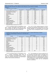 Abgeordnetenhaus Berlin – 17. Wahlperiode Drucksache 17 / 10487 Kinder und Jugendliche in Bedarfsgemeinschaften der Grundsicherung für Arbeitsuchende (SGB II) mit zu be- rücksichtigendem Einkommen aus Erwerbstätigkeit in Berlin Berichtsmonat: Dezember 2011 (Daten mit einer Wartezeit von drei Monaten im SGB II) - Tabelle 6 - Alter in Jahren JobCenter (JC) im Land Berlin 0 bis unter 8 8 bis unter 14 14 bis unter 18 insgesamt Charlottenburg- Wilmersdorf 1.850 1.507 946 4.303 Friedrichshain-Kreuzberg 3.709 3.040 1.942 8.691 Lichtenberg 2.673 1.761 1.009 5.443 Marzahn-Hellersdorf 3.213 2.043 1.153 6.409 Mitte 5.801 4.337 2.724 12.862 Neukölln 5.723 4.181 2.498 12.402 Pankow 2.114 1.479 844 4.437 Reinickendorf 2.663 2.034 1.329 6.026 Spandau 2.708 2.061 1.378 6.147 Steglitz-Zehlendorf 1.257 993 667 2.917 Tempelhof-Schöneberg 3.053 2.459 1.566 7.078 Treptow-Köpenick 1.459 1.113 596 3.168 Berlin insgesamt 36.223 27.008 16.652 79.883 (Datenquelle: Statistik der Bundesagentur für Arbeit) 6. Wie viele der Kinder und Jugendlichen in den unter Zu 6.: Nach Mitteilung der Senatsverwaltung für Ar- 1. erfragten Altersgruppen, die zum Ende des Jahres 2011 beit, Integration und Frauen lebten im Dezember 2011 von staatlichen Transferleistungen abhängig waren, lebten insgesamt 62.854 Berliner Kinder und Jugendliche in nach Kenntnis des Senats in Familien mit Migrationshin- Bedarfsgemeinschaften der Grundsicherung für Arbeitsu- tergrund bzw. mit einem ausländischen Haushaltvorstand? chende (SGB II) mit Migrationshintergrund bzw. einem (Bitte bezirklich aufschlüsseln) ausländischen Haushaltsvorstand. Details sind der nach- folgenden Tabelle 7 zu entnehmen. Kinder und Jugendliche in Bedarfsgemeinschaften der Grundsicherung für Arbeitsuchende (SGB II) in Familien mit Migrationshintergrund bzw. einem ausländischen Haushaltsvorstand in Berlin Berichtsmonat: Dezember 2011 (Daten mit einer Wartezeit von drei Monaten im SGB II) - Tabelle 7 - Alter in Jahren JobCenter (JC) im Land Berlin 0 bis unter 8 8 bis unter 14 14 bis unter 18 insgesamt Charlottenburg- Wilmersdorf 1.711 1.277 755 3.743 Friedrichshain-Kreuzberg 3.684 3.008 1.884 8.576 Lichtenberg 1.582 891 523 2.996 Marzahn-Hellersdorf 1.041 521 308 1.870 Mitte 6.825 4.723 2.858 14.406 Neukölln 5.985 4.145 2.386 12.516 Pankow 661 440 205 1.306 Reinickendorf 2.387 1.528 941 4.856 Spandau 1.829 1.299 819 3.947 Steglitz-Zehlendorf 886 624 404 1.914 Tempelhof-Schöneberg 2.610 2.006 1.263 5.879 Treptow-Köpenick 403 268 174 845 Berlin insgesamt 29.604 20.730 12.520 62.854 (Datenquelle: Statistik der Bundesagentur für Arbeit) Am 31. Dezember 2011 bezogen insgesamt 524 Berli- ner Kinder und Jugendliche in Familien mit einem aus- ländischen Haushaltsvorstand laufende Hilfe zum Le- bensunterhalt außerhalb von Einrichtungen nach dem SGB XII. Details sind der nachfolgenden Tabelle 8 zu entnehmen. 4