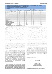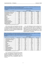 Abgeordnetenhaus Berlin – 17. Wahlperiode Drucksache 17 / 10487 Empfänger/innen laufender Hilfe zum Lebensunterhalt nach dem 3. Kapitel SGB XII unter 18 Jahren außerhalb von Einrichtungen in Berlin am 31. Dezember 2011 in Familien mit einem ausländischen Haushaltsvorstand* - Tabelle 8 - Alter in Jahren Bezirk 0 bis unter 8 8 bis unter 14 14 bis unter 18 insgesamt Charlottenburg- Wilmersdorf 10 4 1 15 Friedrichshain-Kreuzberg 27 20 11 58 Lichtenberg 20 9 2 31 Marzahn-Hellersdorf 11 2 0 13 Mitte 70 31 13 114 Neukölln 88 41 11 140 Pankow 10 5 1 16 Reinickendorf 17 12 4 33 Spandau 11 4 0 15 Steglitz-Zehlendorf 11 7 0 18 Tempelhof-Schöneberg 20 17 8 45 Treptow-Köpenick 23 2 1 26 Berlin insgesamt 318 154 52 524 (Datenquelle: SenGesSoz Berlin/ Berechnung SenGesSoz – I A 4 -) * = Staatsangehörigkeit des Haushaltsvorstandes; Migrationshintergrund bei deutscher Staatsangehörigkeit ist nicht mit erfasst 7. Wie viele Familien erhielten zum Ende des Jahres be gewährleistet? Welche Schlussfolgerungen zieht der 2011 in Berlin einen Kinderzuschlag zur Vermeidung von Senat daraus im Hinblick auf die Kinderregelsätze? ALG-II-Bezug? (bitte bezirklich aufschlüsseln) Zu 9.: Bei der angesprochenen Entscheidung handelt Zu 7.: Nach Auskunft der Bundesagentur für Arbeit – es sich um die Rechtsauffassung der 55. Kammer des Regionaldirektion Berlin-Brandenburg – bezogen am 31. Sozialgerichts Berlin. In anderen Verfahren sowohl in Dezember 2011 insgesamt 2.990 Personen für insgesamt Berlin als auch im übrigen Bundesgebiet hatten Sozialge- 6.938 Kinder Kinderzuschlag. Angaben zur Anzahl der richte keine Zweifel geäußert, dass der Bundesgesetzge- Berechtigten liegen dort nur in denjenigen Fällen vor, in ber die Regelbedarfe im Einklang mit der Entscheidung denen Kinderzuschlag laufend gezahlt wird. Daneben gibt des Bundesverfassungsgerichts vom 09. Februar 2010 es Fälle, in denen Kinderzuschlag nachträglich für einen festgesetzt hat. Insoweit bleibt die erneute Entscheidung bestimmten Zeitraum gezahlt wird. Hierzu sind keine des Bundesverfassungsgerichts abzuwarten. detaillierten Angaben vorhanden. 10.Wann wird der Senat seine in der Koalitionsver- 8. Wie bewertet der Senat zum jetzigen Zeitpunkt die einbarung angekündigte „Strategie zur Bekämpfung der von der Bundesregierung eingeführten Leistungen für Kinderarmut“ vorstellen und welche Schwerpunkte ge- Bildung und Teilhabe im Hinblick auf ihre Sinnhaftigkeit denkt er diesbezüglich zu setzen? zur Minderung der Kinderarmut und ihrer Folgen, insbe- sondere bei der Gewährleistung von gleichberechtigten Zu 10.: Der Senat wird eine Ressort übergreifende Bildungschancen? Arbeitsgruppe zur Erarbeitung von Strategien zur Be- kämpfung von Armut in Berlin einsetzen und dabei die Zu 8.: Bei den Leistungen für Bildung und Teilhabe Ergebnisse des unter Beteiligung wissenschaftlicher Ex- handelt es sich um zweckgerichtete Leistungen zur Errei- perten/innen erarbeiteten 4. Armuts- und Reichtumsbe- chung einer stärkeren Integration bedürftiger Kinder und richts der Bundesregierung einbeziehen. Der Bericht der Jugendlicher in die Gemeinschaft. Durch die bundesge- Bundesregierung soll im Sommer 2012 fertiggestellt setzlich vorgegebene Form der Leistungserbringung, die werden. sicherlich mit einem hohen Verwaltungsaufwand verbun- den ist, soll sichergestellt werden, dass die Leistungen bei den Kindern und Jugendlichen auch tatsächlich ankom- Berlin, den 01. Juni 2012 men. Daher geht der Senat davon aus, dass hiermit ein wichtiger Beitrag zur Minderung von Kinderarmut und zur Gewährleistung von gleichberechtigten Bildungs- In Vertretung chancen geleistet wird. Michael B ü g e 9. Wie bewertet der Senat im Hinblick auf die soziale Senatsverwaltung für Situation von Kindern und Jugendlichen, die von staatli- Gesundheit und Soziales chen Transferleistungen leben, die grundsätzliche Bedeu- tung der Entscheidung des Berliner Sozialgerichts, wo- nach die Höhe der Regelsätze keine ausreichende Teilha- (Eingang beim Abgeordnetenhaus am 07. Juni 2012) 5
