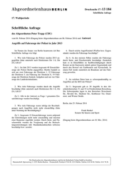 Drucksache 17 / 13 184 Schriftliche Anfrage 17. Wahlperiode Schriftliche Anfrage des Abgeordneten Peter Trapp (CDU) vom 04. Februar 2014 (Eingang beim Abgeordnetenhaus am 06. Februar 2014) und Antwort Angriffe auf Fahrzeuge der Polizei in Jahr 2013 Im Namen des Senats von Berlin beantworte ich Ihre 4. Durch welche Angriffsmittel (Waffen bzw. Gegen- Schriftliche Anfrage wie folgt: stände) wurden die Fahrzeuge beschädigt? 1. Wie viele Fahrzeuge der Polizei wurden 2013 an- Zu 4.: In den meisten Fällen wurden die Fahrzeuge gegriffen (bitte unterteilt nach Direktionen Dir 1-6, Dir durch Stein- und Flaschenwürfe beschädigt. Zusätzlich ZA, LKA)? kam es in Einzelfällen zu Sachbeschädigungen durch Kratzer an der Karosserie mittels spitzer Gegenstände und Zu 1.: Im Jahr 2013 wurden insgesamt 48 Einsatzfahr- durch den Bewurf mit Farbbeuteln und Pyrotechnik. In zeuge der Polizei Berlin angegriffen. Hierbei handelt es einem Fall wurde zusätzlich ein Brandsatz auf das Fahr- sich um zwei Fahrzeuge der Direktion 1, 22 Fahrzeuge zeug geworfen. der Direktion 5, ein Fahrzeug der Direktion 6, 19 Fahr- zeuge der Direktion Zentrale Aufgaben und um vier Fahr- zeuge des Landeskriminalamts. 5. An welchen Orten kam es schwerpunktmäßig zu Angriffen auf die KFZ der Polizei? 2. Wie viele Fahrzeuge wurden durch die Angriffe Zu 5.: Insgesamt gab es 30 Angriffe in den Ab- beschädigt (bitte unterteilt nach Direktionen Dir 1-6, Dir schnittsbereichen 51 und 53 in Friedrichshain-Kreuzberg. ZA, LKA)? Die Schwerpunkte lagen in den Bereichen Warschauer Str., Revaler Str., Skalitzer Str., Kottbusser Tor, Orani- Zu 2.: Alle in der Antwort zu Frage 1 genannten Ein- enstr. und Wiener Straße. satzfahrzeuge wurden beschädigt. Berlin, den 25. Februar 2014 3. Wie viele Fahrzeuge waren infolge der Beschädi- gungen nach Angriffen nicht mehr einsatzfähig (bitte unter Nennung der Beschädigung)? Frank Henkel Senator für Inneres und Sport Zu 3.: Insgesamt 19 Einsatzfahrzeuge waren aufgrund der Einwirkungen nicht mehr einsatzfähig und mussten einer Reparatur zugeführt werden. Durch Stein- und Fla- (Eingang beim Abgeordnetenhaus am 10. Mrz. 2014) schenwürfe wurden die Verglasung und die Beleuch- tungseinrichtungen inkl. Rundumkennleuchten teilweise beschädigt bzw. zerstört. Die Drucksachen des Abgeordnetenhauses sind bei der Kulturbuch-Verlag GmbH zu beziehen. Hausanschrift: Sprosserweg 3, 12351 Berlin-Buckow · Postanschrift: Postfach 47 04 49, 12313 Berlin, Telefon: 6 61 84 84; Telefax: 6 61 78 28.