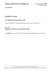 Drucksache 18 / 12 857 Schriftliche Anfrage 18. Wahlperiode Schriftliche Anfrage des Abgeordneten Ronald Gläser (AfD) vom 28. November 2017 (Eingang beim Abgeordnetenhaus am 01. Dezember 2017) zum Thema: Kampf gegen Rechts aus Steuermitteln. Teil 20 und Antwort vom 14. Dezember 2017 (Eingang beim Abgeordnetenhaus am 18. Dez. 2017) Die Drucksachen des Abgeordnetenhauses sind bei der Kulturbuch-Verlag GmbH zu beziehen. Hausanschrift: Sprosserweg 3, 12351 Berlin-Buckow · Postanschrift: Postfach 47 04 49, 12313 Berlin, Telefon: 6 61 84 84; Telefax: 6 61 78 28.