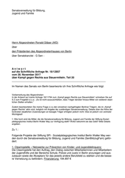 Senatsverwaltung für Bildung, Jugend und Familie Herrn Abgeordneten Ronald Gläser (AfD) über den Präsidenten des Abgeordnetenhauses von Berlin über Senatskanzlei - G Sen - Antwort auf die Schriftliche Anfrage Nr. 18/12857 vom 28. November 2017 über Kampf gegen Rechts aus Steuermitteln. Teil 20 ___________________________________________________________________ Im Namen des Senats von Berlin beantworte ich Ihre Schriftliche Anfrage wie folgt: Vorbemerkung des Abgeordneten: In der Antwort auf meine Anfrage 18/11794 zum „Kampf gegen Rechts aus Steuermitteln“ schreiben Sie auf S.2 zum Frageteil c) u.a.: „Es ist nicht auszuschließen, dass Träger darüber hinaus Mittel von weiteren staat- lichen Stellen erhalten.“ Zudem beantworteten Sie meine Frage c) zu den einzelnen nachgefragten Berliner Trägern, die im „Kampf gegen Rechts“ aktiv sind, lediglich mit Angabe der zuständigen Senatsverwaltung. Details über die Höhe der konkreten staatlichen Zuwendungen an besagte Träger erfolgten jedoch nicht. Dies ist jedoch von zentraler Wichtigkeit! 1. Wie hoch sind die Mittel, die die Senatsverwaltung für Bildung, Jugend und Familie der Stiftung Sozial- pädagogisches Institut Berlin Walter May zur Verfügung stellt? Wofür bekommt sie das Geld? Bitte Details angeben. Zu 1.: Folgende Projekte der Stiftung SPI - Sozialpädagogisches Institut Berlin Walter May wer- den durch die Senatsverwaltung für Bildung, Jugend und Familie (SenBildJugFam) geför- dert: 1. Clearingstelle – Netzwerke zur Prävention von Kinder- und Jugenddelinquenz Die Clearingstelle hat den Auftrag, den Dialog zwischen Mitarbeiterinnen und Mitarbeitern der Jugendhilfe und der Bereiche Schule, Polizei und Justiz in Berlin anzuregen und aus- zubauen sowie die Akzeptanz für das jeweils andere Berufsfeld zu stärken und die besse- re Vernetzung zu befördern. Finanzierung: 194.897 €