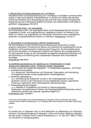 -2- 2. Berliner Büro für Diversionsberatung und –vermittlung Das Berliner Büro für Diversionsberatung und –vermittlung von Ersttätern und deren Eltern existiert in allen sechs Berliner Polizeidirektionen. Im Zentrum der Arbeit steht die Mög- lichkeit des Absehens einer Strafverfolgung nach § 45 JGG nach erfolgter Schadenswie- dergutmachung als erzieherische Reaktion bei leichter und mittelschwerer Kriminalität Ju- gendlicher. Finanzierung: 456.205 € 3. Drehscheibe Kinder- und Jugendpolitik Die Drehscheibe Kinder- und Jugendpolitik Berlin ist die landesweite Berliner Koordinie- rungsstelle für Kinder- und Jugendpolitik und –beteiligung in Berlin. Ihr Auftrag ist, das Recht von Kindern und Jugendlichen auf Partizipation strukturell auf den verschiedenen politischen und gesellschaftlichen Ebenen zu verankern. Finanzierung: 154.257 € 4. Servicestelle im Landesprogramm „Berliner Familienzentren“ Die Servicestelle ist mit der Koordinierung und Beratung der derzeit 36 im Landes- programm geförderten Familienzentren betraut und unterstützt die SenBildJugFam bei der inhaltlichen und finanztechnischen Umsetzung des Programms. Die Servicestelle garan- tiert die Kommunikation und Kooperation zwischen den Akteuren des Landesprogramms. Für die Evaluation ist das von der Servicestelle durchgeführte begleitende Monitoring und die Entwicklung und Fortführung einer umfassenden Datenbank eine entscheidende Grundlage. Finanzierung: 956,000 € 5. Qualifikationsvorbereitung und -begleitung von Teilnehmenden im Projekt „Ressourcen Geflüchteter nutzen - Erzieher/in werden“ (Regiestelle) Im Detail umfasst die Aufgabe der Regiestelle – in Projektphasen gegliedert – die Punkte: Qualifikationsvorbereitung (u.a. Akquise der Teilnehmerinnen und Teilnehmer, Organisation und Verknüpfung von Regelinstrumenten mit den projektinternen Förderangeboten) Qualifizierungsbegleitung (u.a. Verknüpfung des praktischen Lernens in der Kindertagesstätte und des fachlichen Lernens in der Fachschule mit einer begleitenden (berufs-) sprachlichen Förderung, Organisation eines individualisierten Sprachcoachings) Phasenübergreifende Aufgaben (u. a. Mitarbeit im Projektbeirat und Zuarbeit zur Steuerungsgruppe, Kooperation mit projektinternen Partnern wie Kindertagesstätten/Fachschulen und pro- jektexternen Partnern wie Jobcenter, Sprachkursträger etc.) Finanzierung: 2017: 82.960 € 2. Wie hoch sind die Mittel, die die Senatsverwaltung für Integration, Arbeit und Soziales dem Verein Türkischer Bund in Berlin-Brandenburg e.V. zur Verfügung stellt? Wofür bekommt er das Geld? Bitte Details angeben. Zu 2.: Es handelt sich im Folgenden nicht um eine Maßnahme zur Bekämpfung von Rechtsext- remismus. Die Senatsverwaltung für Integration, Arbeit und Soziales, Abteilung Integration hat dem Verein Türkischer Bund in Berlin-Brandenburg e.V. im Jahr 2017 Mittel in Höhe von 100.000 € zur Verfügung gestellt.