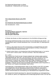 - 3- Am 01.01.2012 bestanden in der Charité keine spezifischen Regelungen hinsichtlich der Erstattungsfähigkeit von internen Bewirtungskosten. Der Wortlaut der Verfahrensanweisung zur Finanzierung von Aufwendungen zur Besucherbetreuung und Repräsentationsaufwand vom 28.12.2016 in der Fassung vom 09.01.2018 kann der Anlage entnommen werden. 7) Welches Senatsmitglied war zum Zeitpunkt der jeweiligen Veranstaltungen zu 2) Vorsitzender des Aufsichtsrats der Charite? Zu 7.: Die Aufsichtsratsvorsitzende der Charité in dem oben genannten Zeitraum war das für Hochschulen zuständige Senatsmitglied, Frau Sandra Scheeres. Berlin, den 25. November 2019 In Vertretung Steffen Krach Der Regierende Bürgermeister von Berlin Senatskanzlei - Wissenschaft und Forschung -