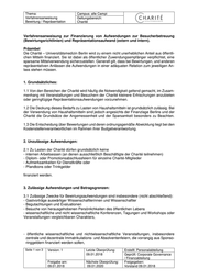 Thema: Campus: alle Campi Verfahrensanweisung Geltungsbereich: Bewirtung / Repräsentation Charité Verfahrensanweisung zur Finanzierung von Aufwendungen zur Besucherbetreuung (Bewirtungsrichtlinien) und Repräsentationsaufwand (extern und intern). Präambel Die Charité – Universitätsmedizin Berlin wird zu einem nicht unerheblichen Anteil aus öffentli- chen Mitteln finanziert. Sie ist dabei als öffentlicher Zuwendungsempfänger verpflichtet, eine sparsame Mittelverwendung sicherzustellen. Generell gilt, dass bei Bewirtungen, und anderen repräsentativen Anlässen die Aufwendungen in einer adäquaten Relation zum jeweiligen An- lass stehen müssen. 1. Grundsätzliches: 1.1 Von den Bereichen der Charité wird häufig die Notwendigkeit geltend gemacht, im Zusam- menhang mit Veranstaltungen und Besuchern der Charité kleinere Erfrischungen anzubieten oder geringfügige Repräsentationsaufwendungen vorzunehmen. 1.2 Die Deckung dieses Bedarfs zu Lasten von Haushaltsmitteln ist grundsätzlich zulässig. Bei der Verwendung von Haushaltsmitteln sind jedoch angesichts der Finanzlage Berlins und der Charité die Grundsätze der Angemessenheit und der Sparsamkeit besonders zu Beachten. 1.3 Die Entscheidung über Bewertungen und deren ordnungsgemäße Abwicklung liegt bei den Kostenstellenverantwortlichen im Rahmen ihrer Budgetverantwortung. 2. Unzulässige Aufwendungen: 2.1 Zu Lasten der Charité dürfen grundsätzlich keine - internen Arbeitsessen (an denen ausschließlich Beschäftigte der Charité teilnehmen) - Diplom- oder Promotionsabschlussfeiern für einzelne Charité-Mitglieder - Aufmerksamkeiten für Dienstkräfte oder - Pfandbons oder Trinkgelder finanziert werden. 3. Zulässige Aufwendungen und Betragsgrenzen: 3.1 Zulässige Zwecke für Bewirtungsaufwendungen sind insbesondere (nicht abschließend): - Gastvorträge auswärtiger Wissenschaftlerinnen und Wissenschaftler - Begutachtungen und Evaluationen - Besuche von herausgehobenen Persönlichkeiten des öffentlichen Lebens - wissenschaftliche und nicht wissenschaftliche Konferenzen, Tagungen und Workshops oder Veranstaltungen vergleichbaren Charakters, - öffentliche wissenschaftliche und nichtwissenschaftliche Veranstaltungen, insbesondere zentrale und dezentrale Immatrikulations- und Absolventenfeiern, die vorrangig aus Sponso- ringgeldern finanziert werden sollen, Seite 1 von 3 Version: 1 Letzte Überprüfung: Erstellt: Personalabteilung 09.01.2018 Geprüft: Corporate Governance / Finanzabteilung Freigabe am: Nächste Überprüfung: Freigegeben: 09.01.2018 09.01.2020 Vorstand 09.01.2018