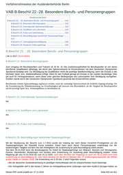 Verfahrenshinweise der Ausländerbehörde Berlin VAB B.BeschV.22.-28. Besondere Berufs- und Personengruppen Inhaltsverzeichnis B.BeschV.22. - 28. Besondere Berufs- und Personengruppen ........ 619 B.BeschV.22. Besondere Berufsgruppen .................................. 619 B.BeschV.23. Internationale Sportveranstaltungen ................... 619 B.BeschV.24. Schifffahrt und Luftverkehr ................................. 619 B.BeschV.25. Kultur und Unterhaltung ...................................... 619 B.BeschV.26. Beschäftigungen bestimmter Staatsangehöriger ...... 619 B.BeschV.27. Grenzgängerbeschäftigung ................................ 620 B.BeschV.28. Deutsche Volkszugehörige ................................. 620 B.BeschV.22. - 28. Besondere Berufs- und Personengruppen ( 06.11.2017; 23.10.2018 ) B.BeschV.22. Besondere Berufsgruppen Zum Umgang mit Berufssportlern und Trainern (§ 22 Nr. 4): Die Zustimmungsfreiheit für Berufssportler ist von deren beruflicher Qualifikation abhängig, die durch den Spitzenverband im Einvernehmen mit dem Deutschen Olympischen Sportbund bestätigt wird. Zur Bestätigung der Qualifikation reicht die jeweilige Spielberechtigung, wenn der Einsatz in der höchsten Spiel- bzw. Wettkampfklasse erfolgt. Allein für den Fußball genügt ein Einsatz in der zweiten Bundesliga. Dies gilt auch für Vertragsamateure, wenn diese unter gleichen Bedingungen wie Lizenzspieler ihrer Betätigung nachgehen. Insofern wurde durch den Deutschen Olympischen Sportbund pauschal das Einvernehmen erklärt. Berufstrainer können ligenunabhängig zugelassen werden, wenn der zuständige Spitzenverband die fachliche Eignung bestätigt. Für die Formulierung der Nebenbestimmung zur Erwerbstätigkeit gilt insoweit eine Besonderheit, als die Tätigkeit bei Berufssportlern auf die jeweilige Spiel- bzw. Wettkampfklasse zu beschränken ist. B.BeschV.23. Internationale Sportveranstaltungen frei B.BeschV.24. Schifffahrt und Luftverkehr frei B.BeschV.25. Kultur und Unterhaltung frei B.BeschV.26. Beschäftigungen bestimmter Staatsangehöriger Mit der Neufassung der BeschV zum 1.7.2013 wurde der Katalog der nach dieser Vorschrift Privilegierten um die Staatsangehörigen der Republik Korea erweitert. Damit kann auch dieser Personengruppe unabhängig von der beabsichtigten Tätigkeit und dem Sitz des Arbeitgebers die Zustimmung für jede Beschäftigung erteilt werden. Seit dem 28.10.2015 kann die Bundesagentur für Arbeit für Staatsangehörige von Albanien, Bosnien und Herzegowina, Kosovo, Mazedonien, Montenegro und Serbien eine Zustimmung zur Ausübung jeder Beschäftigung erteilen. Diese Regelung gilt vom 01.01.2016 bis zum 31.12.2020; nach dem Wortlaut der Regelung ist auch am 30.12.2020 noch eine Zustimmung zur Beschäftigung für zwei Jahre denkbar (so die BA im Rahmen des 72. Erfahrungsaustausches der ABHen großer Städte im Oktober 2018). Die Anwendung von § 26 Abs. 2 setzt Folgendes voraus: Bei der deutschen Auslandsvertretung im jeweiligen Herkunftsstaat wird ein entsprechendes Visum beantragt. Der Antragsteller darf in den letzten 2 Jahren vor Antragstellung keine Leistungen nach dem AsylbLG bezogen haben, es Dieses PDF wurde erstellt am: 27.11.2018 Seite 619 von 811
