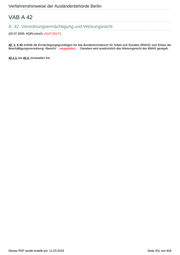 Verfahrenshinweise der Ausländerbehörde Berlin VAB A 42 A. 42. Verordnungsermächtigung und Weisungsrecht (20.07.2005; HQRLUmsG; 24.07.2017 ) 42. 0. § 42 enthält die Ermächtigungsgrundlagen für das Bundesministerium für Arbeit und Soziales (BMAS) zum Erlass der Beschäftigungsverordnung –BeschV ...weggefallen... . Daneben wird ausdrücklich das Weisungsrecht des BMAS geregelt. 42.1.1. bis 42.3. einstweilen frei Dieses PDF wurde erstellt am: 11.03.2019 Seite 331 von 818