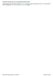 Verfahrenshinweise der Ausländerbehörde Berlin Qualifizierungszentrum des BAMF, Badensche Str. 23 , 10715 Berlin, Telefon: (030) 684 081 475 00 , Fax: (030) 684 081 471 15 , Mail-Adresse: BER-Posteingang@bamf.bund.de, zu verweisen. Dieses PDF wurde erstellt am: 11.03.2019 Seite 337 von 818