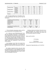 Drucksache 17 / 14 116 Schriftliche Anfrage 17. Wahlperiode Schriftliche Anfrage des Abgeordneten Tom Schreiber (SPD) vom 25. Juni 2014 (Eingang beim Abgeordnetenhaus am 02. Juli 2014) und Antwort Berliner Feuerwehr – Wachensterben in Randlagen Berlins? Im Namen des Senats von Berlin beantworte ich Ihre Schriftliche Anfrage wie folgt: 1. Wie bewertet der Berliner Senat die Situation der einzelnen Freiwilligen Feuerwehren an den Randlagen, im Hinblick auf die Mitgliederstruktur? Zu 1.: Die Direktion Nord hat 27 Freiwillige Feuerwehren, davon - 20 Freiwillige Feuerwehren des Typ A mit eigenem Ausrückebereich - 7 Freiwillige Feuerwehren des Typ B ohne eigenen Ausrückebereich. Die Direktion Süd hat 20 Freiwillige Feuerwehren, davon - 12 Freiwillige Feuerwehren des Typ A mit eigenem Ausrückebereich - 8 Freiwillige Feuerwehren des Typ B ohne eigenen Ausrückebereich. Die Direktion West hat 10 Freiwillige Feuerwehren, davon - 3 Freiwillige Feuerwehren des Typ A mit eigenem Ausrückebereich - 7 Freiwillige Feuerwehren des Typ B ohne eigenen Ausrückebereich. Die Mitgliederstruktur der Freiwilligen Feuerwehren in den Randlagen ist wie in den übrigen Freiwilligen Feuerwehren Schwankungen unterworfen. Über Jahre hinweg zeigen sich Schwankungen in der 2. Wie viele Mitglieder sind in den jeweiligen Direk- Zahl der freiwilligen Feuerwehrleute. Insgesamt besteht tionen bei der Freiwilligen Feuerwehr vorhanden jedoch derzeit für keine Freiwillige Feuerwehr eine akute personelle Gefahr, die eine Einstellung des Dienstbetrie- Zu 2.: Die Entwicklung des Personalbestandes der bes zur Folge hätte. Für die Zukunft muss verstärkt Freiwilligen Feuerwehren in den Direktionen Nord, Süd Nachwuchsgewinnung betrieben werden, um auf die und West stellt sich wie folgt dar: demographische Entwicklung und das geänderte Freizeit- verhalten der Bürgerinnen und Bürger angemessen reagie- ren zu können. Dazu gehören u.a. auch attraktive Feuer- wachen. In den Randlagen stellt sich durch eine oft schwierige Wohnungssituation die Gewinnung von Nachwuchs schwierig dar. Es ist in einigen Ortslagen für junge Inte- ressentinnen und Interessenten für die Tätigkeit in einer Freiwilligen Feuerwehr nicht möglich, bezahlbaren Wohnraum zu finden. Hier wäre eine stärkere Unterstüt- zung von ortsansässigen Wohnungsbaugesellschaften hilfreich. Die Drucksachen des Abgeordnetenhauses sind bei der Kulturbuch-Verlag GmbH zu beziehen. Hausanschrift: Sprosserweg 3, 12351 Berlin-Buckow · Postanschrift: Postfach 47 04 49, 12313 Berlin, Telefon: 6 61 84 84; Telefax: 6 61 78 28.