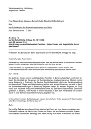 Senatsverwaltung für Bildung, Jugend und Familie Frau Abgeordnete Marianne Burkert-Eulitz (Bündnis 90/Die Grünen) über den Präsidenten des Abgeordnetenhauses von Berlin über Senatskanzlei - G Sen - Antwort auf die Schriftliche Anfrage Nr. 18/13 068 vom 08. Januar 2018 über Kinder aus suchtbelasteten Familien – fallen Kinder und Jugendliche durch das Raster? ___________________________________________________________________ Im Namen des Senats von Berlin beantworte ich Ihre Schriftliche Anfrage wie folgt: Vorbemerkung der Abgeordneten: Vorbemerkung: Die Bundesdrogenbeauftragte schätzt, dass drei Millionen Kinder in Deutschland in suchtbe- lasteten Familien aufwachsen, wobei die Dunkelziffer noch viel höher sein soll. 1. Wie viele Kinder und Jugendliche wachsen derzeit in suchtbelasteten Familien in Berlin auf? 2. Über welche statistischen Daten hinsichtlich dieser Betroffenengruppe verfügt der Berliner Senat? Zu 1. und 2.: Die Zahl der Kinder, die in suchtbelasteten Familien in Berlin aufwachsen, wird nicht er- fasst. Ein Großteil der Personen mit Suchtproblemen (insbesondere bei Alkohol) nimmt keine Betreuung in Anspruch. Die Berliner Suchthilfestatistik, die in der Senatsverwaltung für Gesundheit, Pflege und Gleichstellung geführt wird, erfasst Personen, die sich in Berli- ner Suchthilfeeinrichtungen in Betreuung begeben haben. Es werden Angaben zur Diag- nose, zum Haushalt und zum Familienstand sowie zur Zahl der Kinder erfasst. Demzufol- ge lebten in 2016 ca. 1500 Kinder in einem Haushalt, in dem sich mindestens ein Erwach- sener in eine Berliner Suchthilfeeinrichtung begeben hat. 3. Mit welchen konkreten Suchtbelastungen müssen die betroffenen Kinder aufwachsen? Welche statisti- schen Erkenntnisse liegen dem Senat dazu vor? Zu 3.: Der größte Teil der betroffenen Kinder wächst bei Eltern auf, von denen mindestens ein Elternteil Probleme mit Alkohol hat. Kinder von Eltern, die von Opiaten und/oder Kokain und anderen Substanzen abhängig sind, leben häufig nicht mehr im Haushalt der Eltern.