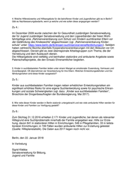 -2- 4. Welche Hilfenetzwerke und Hilfeangebote für die betroffenen Kinder und Jugendlichen gibt es in Berlin? Gibt es Nachbesserungsbedarfe, wenn ja welche und wie sollen diese angegangen werden? Zu 4.: Im Dezember 2009 wurde zwischen der für Gesundheit zuständigen Senatsverwaltung, der für Jugend zuständigen Senatsverwaltung und den Ligaverbänden der freien Wohl- fahrtspflege eine „Rahmenvereinbarung zum Schutz von Kindern suchtkranker Eltern vor der Gefährdung des Kindeswohls“ abgeschlossen (vgl. „Rahmenvereinbarung Kinder- schutz“ unter: https://www.berlin.de/lb/drogen-sucht/service/veroeffentlichungen/). Seitdem haben zahlreiche Bezirke ebenfalls Kooperationsvereinbarungen mit den Akteuren vor Ort abgeschlossen. Derzeit gibt es zwei überregionale Arbeitsgruppen zum Thema, die der Vernetzung und dem Austausch dienen. Die Hilfeangebote sind vielfältig und beinhalten stationäre und ambulante Angebote sowie Patenschaftsprojekte, die den Einsatz Ehrenamtlicher begleiten. 5. Kinder in suchtbelasteten Familien leiden unter einem Mangel an emotionaler Zuwendung, Vertrauen und Zuverlässigkeit. Oft übernehmen sie Verantwortung für ihre Eltern. Welchen Entwicklungsdefiziten und Ge- fährdungsrisiken sind diese Kinder ausgesetzt? Zu 5.: Kinder aus suchtbelasteten Familien tragen neben erheblichen Entwicklungsrisiken ein signifikant erhöhtes Risiko für eine eigene Suchtentwicklung sowie für psychische Erkran- kungen und soziale Schwierigkeiten (vgl. dazu: „Kinder aus suchtbelasteten Familien“, Broschüre der Drogenbeauftragten der Bundesregierung, Mai 2017). 6. Wie viele dieser Kinder werden in Berlin stationär untergebracht und wie viele ambulante Hilfen werden für diese Kinder und Familien zur Verfügung gestellt? Zu 6.: Zum Stichtag 31.12.2016 erhielten 2.171 Kinder und Jugendliche, bei denen als relevanter Hilfegrund eine Suchtproblematik innerhalb der Familie angegeben war, Hilfe zur Erzie- hung, davon 841 in stationären Hilfen in Einrichtungen, 548 in Pflegefamilien, 33 in teilsta- tionären Einrichtungen; in 749 Fällen wurden ambulante Hilfen zur Erziehung geleistet (Quelle: Hilfeplanstatistik). Die Daten aus 2017 liegen noch nicht vor. Berlin, den 22. Januar 2018 In Vertretung Sigrid Klebba Senatsverwaltung für Bildung, Jugend und Familie