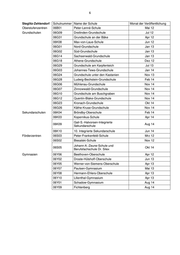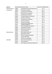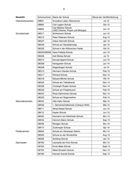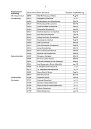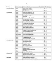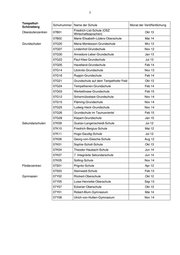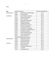 1 Anlage Mitte Schulnummer Name Monat der Veröffentlichung Oberstufenzentren 01B01 OSZ Banken und Versicherungen Jan 14 01B04 OSZ Gesundheit I Okt 13 Grundschulen 01G11 Kurt-Tucholsky-Grundschule Mai 12 01G41 Erika-Mann-Grundschule Mai 12 01G42 Anna-Lindh-Schule Jul 12 01G28 Brüder-Grimm-Grundschule Feb 13 01G31 Wedding-Grundschule Okt 12 01G36 Andersen-Grundschule Dez 12 01G24 Gottfried-Röhl-Grundschule Feb 14 01G45 Leo-Lionni-Grundschule Jan 14 01G01 Grundschule am Arkonaplatz Aug 14 01G08 Grundschule am Brandenburger Tor Apr 14 01G18 Carl-Bolle-Grundschule Jul 14 01G37 Heinrich-Seidel-Grundschule Jul 14 01G15 Anne-Frank-Grundschule Nov 14 01G19 Hansa-Grundschule Nov 14 01G43/01S06 Albert-Gutzmann-Schule Mrz 15 Sekundarschulen 01K06 Herbert-Hoover-Schule Okt 12 01K02 Ernst-Schering-Schule Sep 13 01K09 Hedwig-Dohm-Schule Apr 14 Gymnasien 01Y02 John-Lennon-Schule Feb 12 01Y09 Diesterweg-Schule Mai 13 01Y10 Theodor-Heuss-Oberschule Jun 13 01Y12 12. Schule Okt 13 01Y08 Lessing-Gymnasium Aug 14