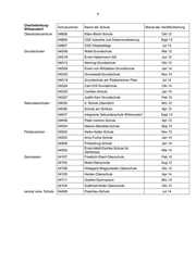 4 Charlottenburg- Schulnummer Name der Schule Monat der Veröffentlichung Wilmersdorf Oberstufenzentrum 04B08 Kläre-Bloch-Schule Okt 12 04B06 OSZ Industrie und Datenverarbeitung Sept 13 04B07 OSZ Körperpflege Jul 13 Grundschulen 04G06 Wald-Grundschule Mai 12 04G18 Ernst-Habermann-GS Jun 12 04G13 Nehring-Grundschule Okt 12 04G09 Erwin-von-Witzleben-Grundschule Jan 14 04G22 Grunewald-Grundschule Nov 13 04G19 Grundschule am Rüdesheimer Platz Jul 14 04G24 Carl-Orff-Grundschule Okt 14 04G25 Cecilien-Schule Jan 15 04G27 Judith-Kerr-Grundschule Feb 15 Sekundarschulen 04K05 5. Schule (GemSch) Mrz 12 04K06 Schule am Schloss Apr 12 04K07 Integrierte Sekundarschule Wilmersdorf Sept 13 04K08 Peter-Ustinov-Schule Apr 13 04K04 Nelson-Mandela-Schule Sep 13 Förderzentren 04S03 Helen-Keller-Schule Nov 12 04S02 Arno-Fuchs-Schule Jan 14 04S06 Finkenkrug-Schule Jan 14 Ernst-Adolf-Eschke-Schule für 04S05 Mai 14 Gehörlose Gymnasien 04Y07 Friedrich-Ebert-Oberschule Feb 12 04Y02 Wald-Oberschule Aug 12 04Y08 Hildegard-Wegscheider-Oberschule Okt 13 04Y05 Herder-Oberschule Apr 14 04Y11 Goethe-Gymnasium Mrz 14 04Y04 Gottfried-Keller-Oberschule Okt 14 zentral verw. Schule 04A08 Poelchau-Schule Jul 14