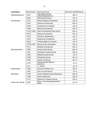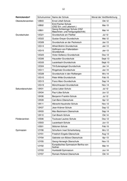 11 Lichtenberg Schulnummer Name der Schule Monat der Veröffentlichung Hein-Moeller-Schule Oberstufenzentrum 11B01 Mai 13 (OSZ Energietechnik II) 11B03 OSZ Bürowirtschaft II Okt 14 Grundschulen 11G14 Richard-Wagner-Grundschule Aug 12 11G21 Schule Am Faulen See Mrz 12 11G03 Grundschule im Gutspark Jan 13 11G08 Robinson-Grundschule Nov 12 11G15/11S04 Paul-und-Charlotte-Kniese-Schule Dez 12 11G19 Obersee-Grundschule Nov 12 11G10 Schule im Ostseekarree Jan 14 11G13 Karlshorster Grundschule Jan 14 11G23 Friedrichsfelder Grundschule Okt 13 11G16/11S01 Schule an der Victoriastadt Aug 14 11G17 Brodowin-Grundschule Nov 14 Sekundarschulen 11K08 George-Orwell-Schule Sep 12 11K01 Alexander-Puschkin-Schule Mrz 13 11K02 Mildred-Harnack-Schule Jul 13 11K09 Philipp-Reis-Schule Mrz 13 11K06 Schule am Rathaus Mrz 14 Grüner Campus Malchow 11K10 Jul 14 (GemSch) 11K11 11. Schule Jun 14 Förderzentren 11S08 Schule Am Breiten Luch Okt 12 11S07 Carl-von-Linné-Schule Jul 14 Gymnasien 11Y02 Johann-Gottfried-Herder-Oberschule Sep 12 11Y09 Barnim-Oberschule Aug 12 11Y10 Manfred-von-Ardenne-Schule Okt 13 Schul- und Leistungssportzentrum zentral verw. Schule 11A07 Jun 14 Berlin