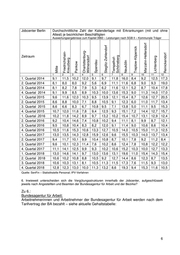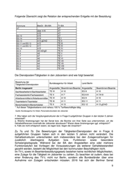 Jobcenter Berlin Durchschnittliche Zahl der Kalendertage mit Erkrankungen (mit und ohne Attest) je bezirklichen Beschäftigten Auswertungsergebnisse zum Kapitel 3960 – Leistungen nach SGB II – Kommunale Träger Steglitz-Zehlendorf Treptow-Köpenick Marzahn-Hellersdorf Friedrichshain- Charlottenburg- Reinickendorf Tempelhof- Zeitraum Pankow Wilmersdorf Spandau Neukölln Lichtenberg Mitte Kreuzberg Schöneberg 1 2 3 4 5 6 7 8 9 10 11 12 1. Quartal 2014 9,1 11,5 10,2 12,0 9,1 9,7 11,8 16,0 8,4 9,2 12,5 17,3 2. Quartal 2014 8,1 8,0 8,0 9,2 5,6 6,9 11,1 11,6 6,8 9,0 9,3 19,0 3. Quartal 2014 8,1 8,2 7,8 7,9 5,3 6,2 11,6 12,1 5,2 8,7 10,4 17,8 4. Quartal 2014 9,1 9,9 8,5 8,9 10,3 10,0 13,6 15,3 9,0 11,3 14,0 17,0 1. Quartal 2015 9,6 11,6 12,0 10,3 9,5 13,9 12,1 15,4 8,7 12,6 12,7 20,5 2. Quartal 2015 8,6 8,8 10,0 7,1 8,8 10,5 9,1 12,3 6,0 11,0 11,7 13,4 3. Quartal 2015 8,6 6,6 8,3 6,7 10,8 9,5 7,1 13,8 5,0 11,1 9,5 15,3 4. Quartal 2015 10,7 12,0 11,6 7,8 9,4 12,5 9,3 15,1 7,2 14,4 12,7 15,7 1. Quartal .2016 10,2 11,8 14,2 8,9 9,7 13,2 10,2 15,4 10,7 13,1 12,9 12,4 2. Quartal 2016 9,2 10,4 14,6 7,4 10,8 10,2 9,4 11,1 8,1 9,9 8,7 12,1 3. Quartal 2016 9,5 10,8 10,4 8,3 8,2 12,0 9,1 11,4 9,0 10,6 8,6 10,4 4. Quartal 2016 10,5 11,6 15,3 10,6 13,3 12,7 10,5 14,0 10,5 15,0 11,3 12,5 1. Quartal 2017 13,0 13,5 14,3 12,8 15,9 12,6 9,6 15,5 10,3 14,0 13,7 13,4 2. Quartal 2017 9,4 11,7 10,1 9,9 10,4 10,8 8,7 10,1 7,8 9,2 11,2 8,4 3. Quartal 2017 9,6 10,1 12,3 11,4 7,6 10,2 8,6 12,4 7,8 10,8 12,2 12,2 4. Quartal 2017 11,1 14,1 12,5 9,9 9,3 10,2 10,6 15,2 10,3 10,0 12,7 13,3 1. Quartal 2018 13,0 14,6 14,1 9,7 13,0 13,6 13,1 19,6 11,0 15,4 14,3 15,4 2. Quartal 2018 10,6 10,2 10,8 8,8 10,5 9,2 12,7 14,4 8,6 12,3 8,7 13,5 3. Quartal 2018 10,6 10,3 13,1 8,1 10,5 11,3 11,5 17,3 7,6 11,5 9,3 13,0 4. Quartal 2018 12,8 12,3 13,0 10,0 11,3 13,2 8,6 19,3 9,4 15,3 11,6 10,5 Quelle: SenFin – Statistikstelle Personal; IPV-Verfahren 6. Inwieweit unterscheiden sich die Vergütungsstrukturen innerhalb der Jobcenter, aufgeschlüsselt jeweils nach Angestellten und Beamten der Bundesagentur für Arbeit und der Bezirke? Zu 6.: Bundesagentur für Arbeit: Arbeitnehmerinnen und Arbeitnehmer der Bundesagentur für Arbeit werden nach dem Tarifvertrag der BA bezahlt – siehe aktuelle Gehaltstabelle: 6