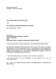 Senatsverwaltung für Integration, Arbeit und Soziales Herrn Abgeordneten Florian Swyter (FDP) über den Präsidenten des Abgeordnetenhauses von Berlin über Senatskanzlei - G Sen - Antwort auf die Schriftliche Anfrage Nr. 18/19942 vom 14. Juni 2019 über Jobcenter in Berlin: ungleiche Vergütung für gleiche Arbeit? ------------------------------------------------------------------------------------------------------------------------------- Im Namen des Senats von Berlin beantworte ich Ihre Schriftliche Anfrage wie folgt: Die Schriftliche Anfrage betrifft Sachverhalte, die der Senat nicht allein aus eigener Zuständigkeit und Kenntnis beantworten kann. Er ist gleichwohl um eine sachgerechte Antwort bemüht und hat daher die zuständige Regionaldirektion Berlin-Brandenburg (RDBB) der Bundesagentur für Arbeit (BA) um Stellungnahme gebeten, die bei der nachfolgenden Beantwortung berücksichtigt ist. 1. Wie viele Beschäftigte arbeiten in den Jobcentern (bitte nach Bezirken aufschlüsseln)? 2. Wie viele von ihnen sind bei der Bundesagentur für Arbeit angestellt und wie viele sind Kommunalbeschäftigte? Zu 1. und 2.: Die folgende Übersicht stellt die Vollzeitäquivalente mit Berichtsmonat März 2019 dar. 1
