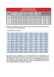 Beamtinnen und Beamte der BA erhalten Bezüge nach der Bundesbesoldungsordnung – siehe anliegende Besoldungstabelle: Die Bewertung der Dienstposten ist für Arbeitnehmerinnen und Arbeitnehmer und Beamtinnen und Beamte der BA auch in den Jobcentern gleich. Für Arbeitnehmerinnen und Arbeitnehmer wurden mit dem Tarifvertrag der BA Tätigkeitsebenen definiert, für die Beamtinnen und Beamten gibt es durch die Bundesbesoldungsordnung entsprechend festgelegte Besoldungsgruppen. Beide Beschäftigtengruppen sind nach ihrem Aufgabeninhalt den Dienstposten zugeordnet. 7